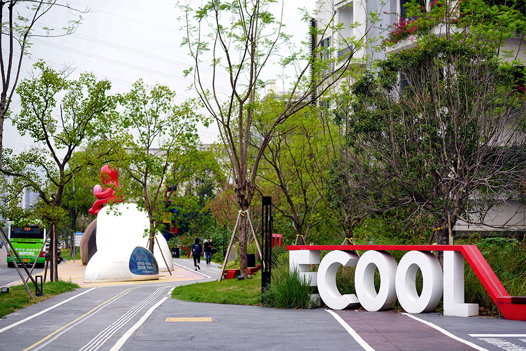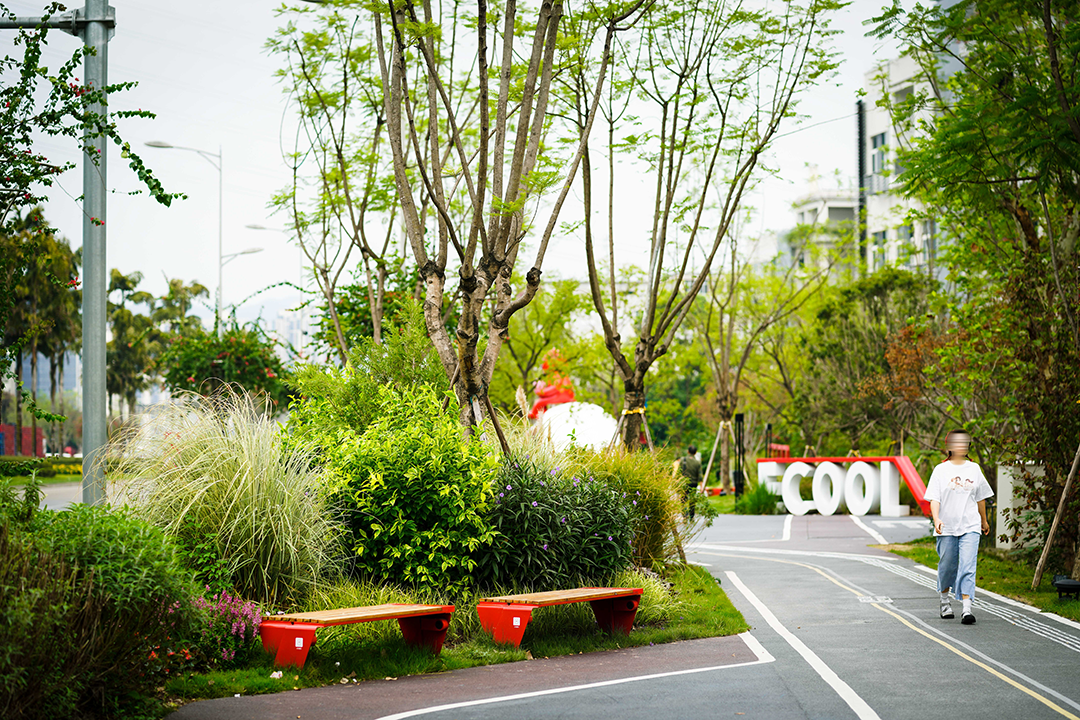 针对沿路绿化做减法,取消遮挡视线的郁闭乔木以及高灌木,保留长势较佳的银杏,增加有季相变化的美国红枫、黄花风铃木 、黄葛树等,下层采用以观赏性植物为主的花境,形成舒朗通透的道路绿化空间,并且增加LOGO、小品,强化城市界面,增添氛围感。被替换掉的植物被移植到附近的街道和公园内,继续为市民绿色生活添彩。