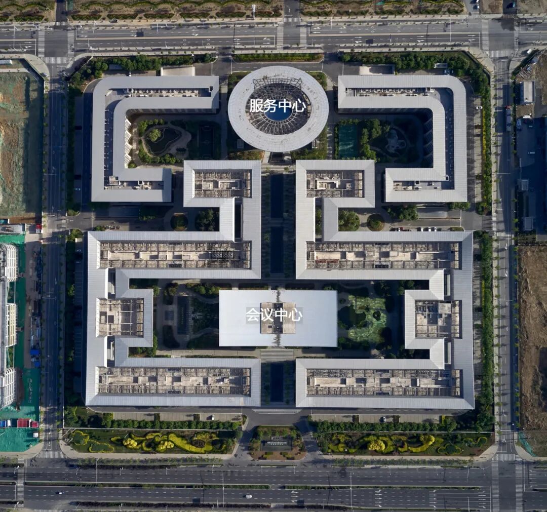 方案沿南北主轴对称布局,犹如书法篆刻,以气势磅礴的中心建筑—会议中心起笔,通过飞檐将两侧试验单元连接起来,与研发单元一起勾勒出朝揖相连的行笔意韵,最后以圆形服务中心收笔,构成一幅气韵生动的大地书法。同时,多个景致各异的庭院散落其间,犹如曲水流觞般自由流动于建筑之中,形成绿意葱茏的公园式科学产业聚落。