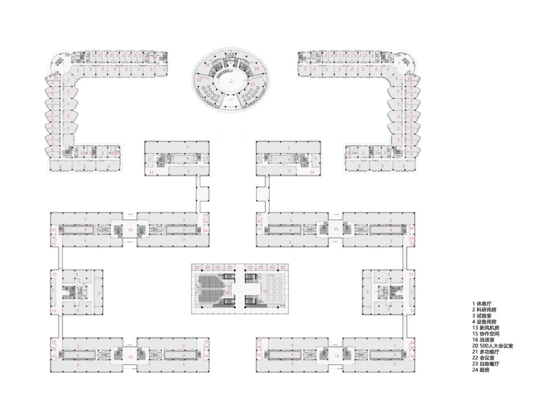 作为本项目主体功能的中试空间以模块化、标准化为原则,兼顾灵活性与可变性,8 个类相似试验模块(A、B、C模块)围绕会议中心,沿用地边界展开设置,满足多样化试验需求。多组多规模试验模件单元,或两两组合,或连廊串联,即保证了中试试验的相对独立性,又实现了整个园区室内空间的可达性和高效联系。为科研建筑标准化建造的探索,提供了行之有效的设计实践。