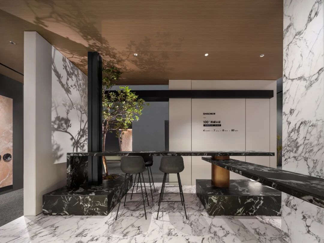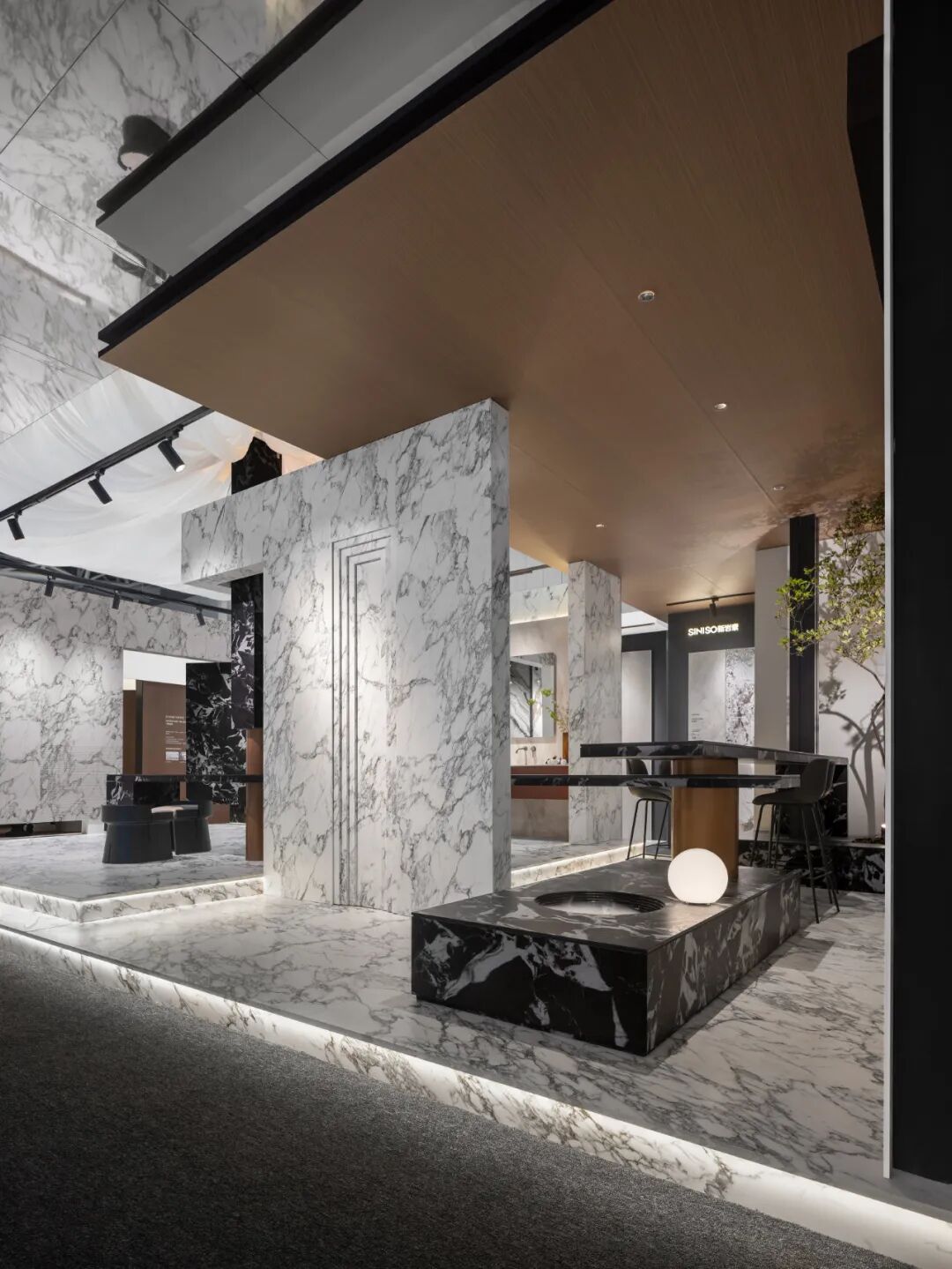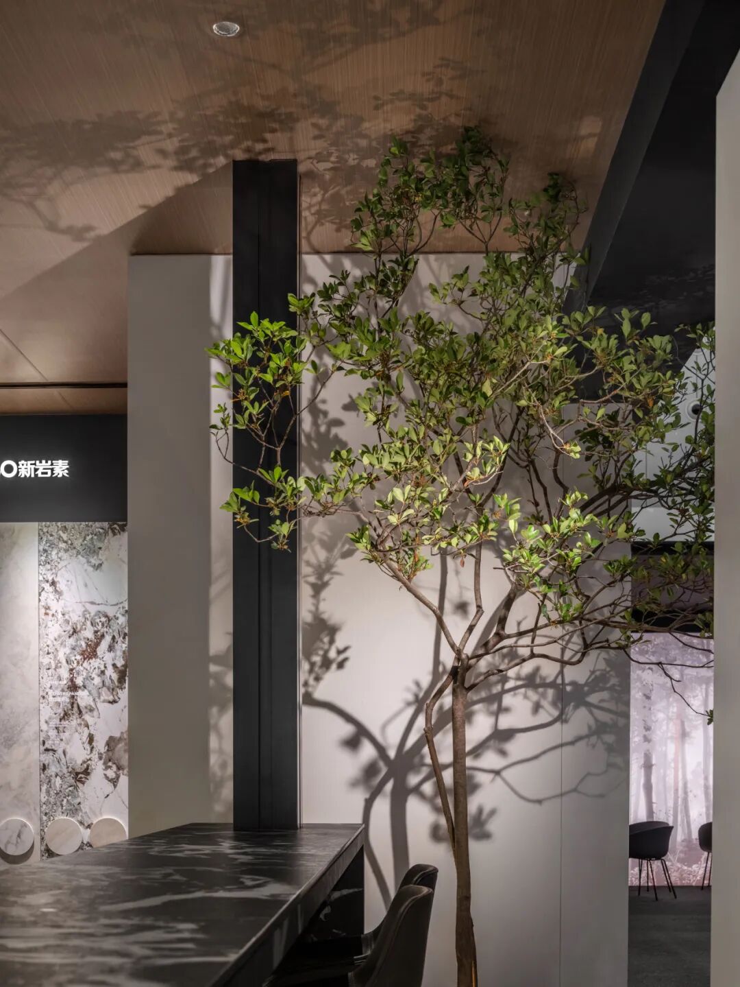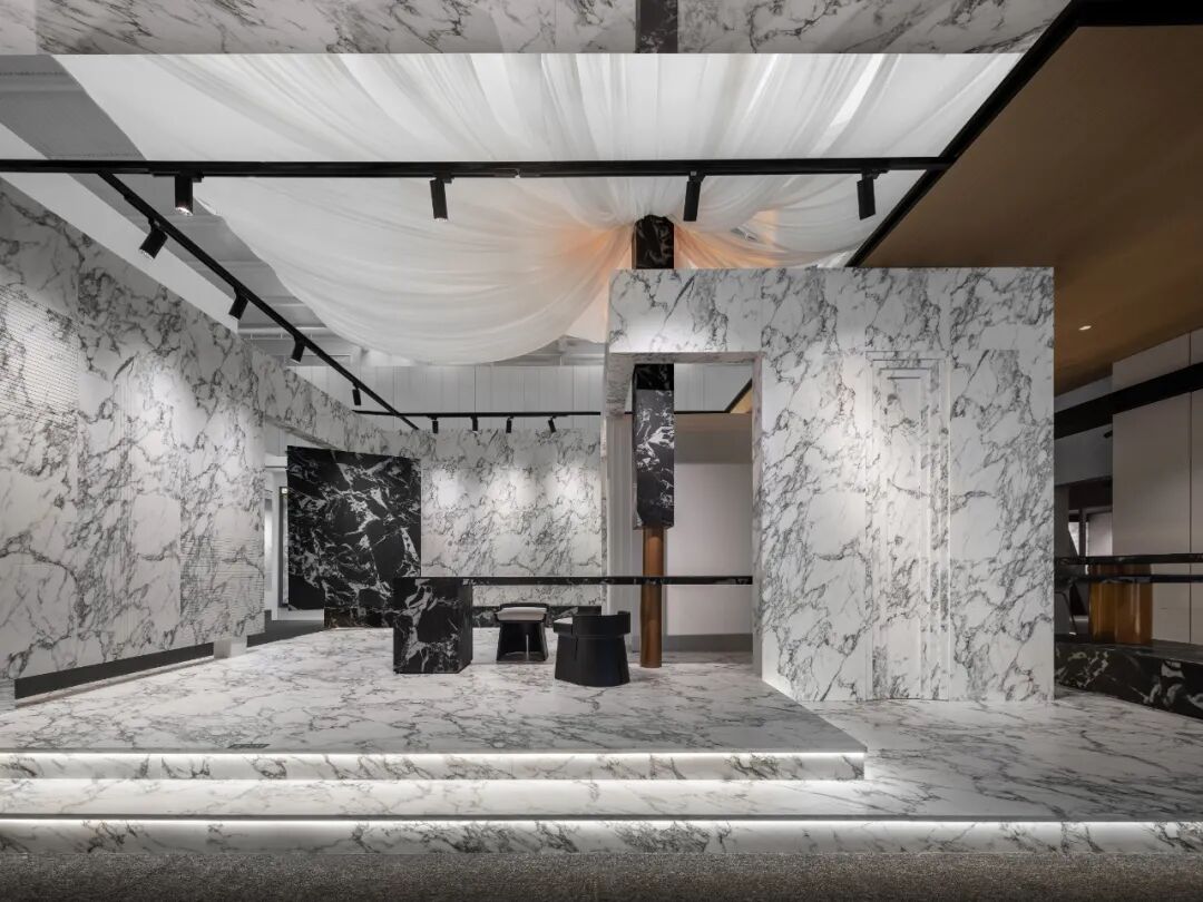 纯白纱幔从深色天花倾泻而下,柔化石材体块的冷峻感,与岩板构筑的体块形成"刚柔对话"。