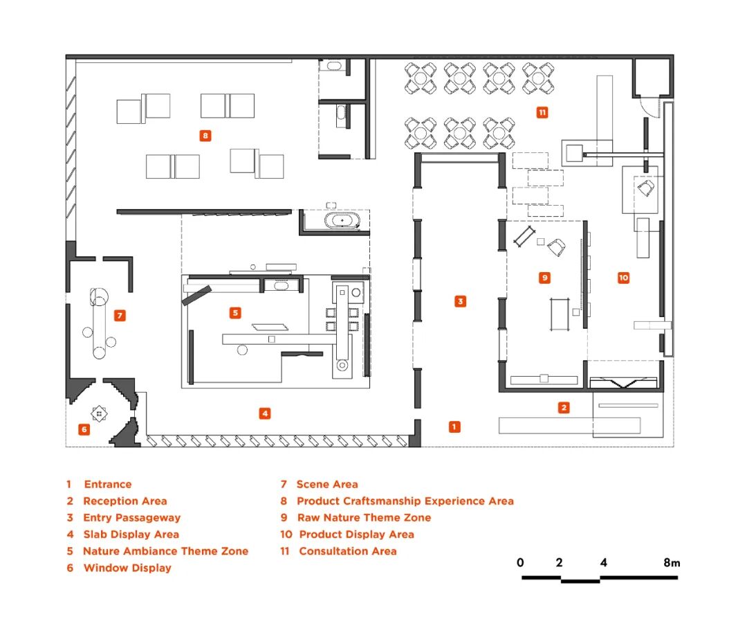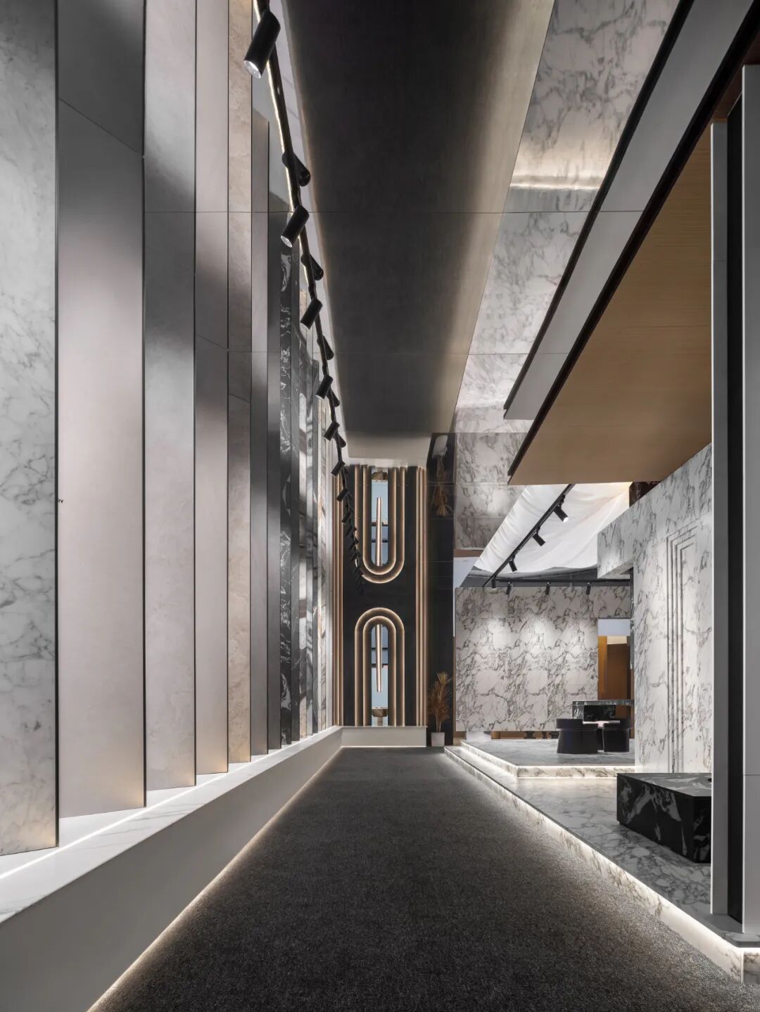 Seriated stone slabs build vertical rhythm, engaging in virtual-actual dialogue with mirrored ceilings. The stone-clad space eliminates superfluous decor, letting material texture and light articulate product narratives.