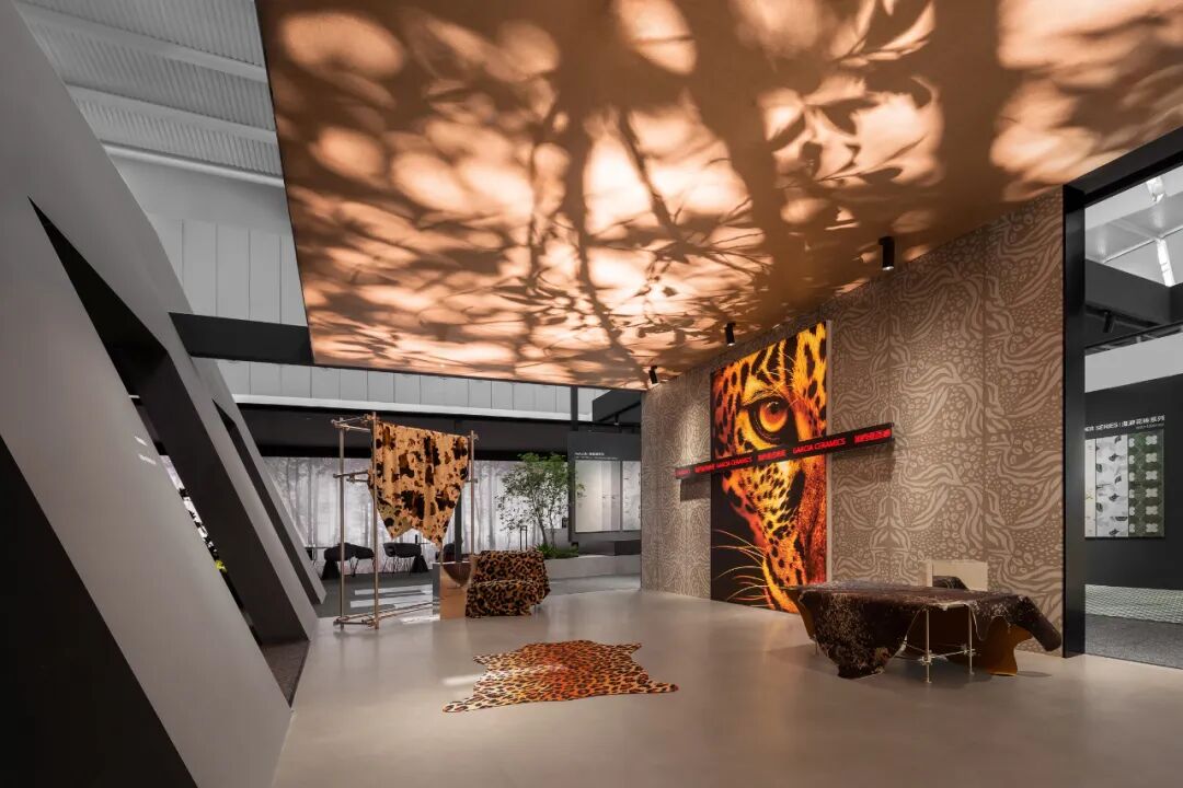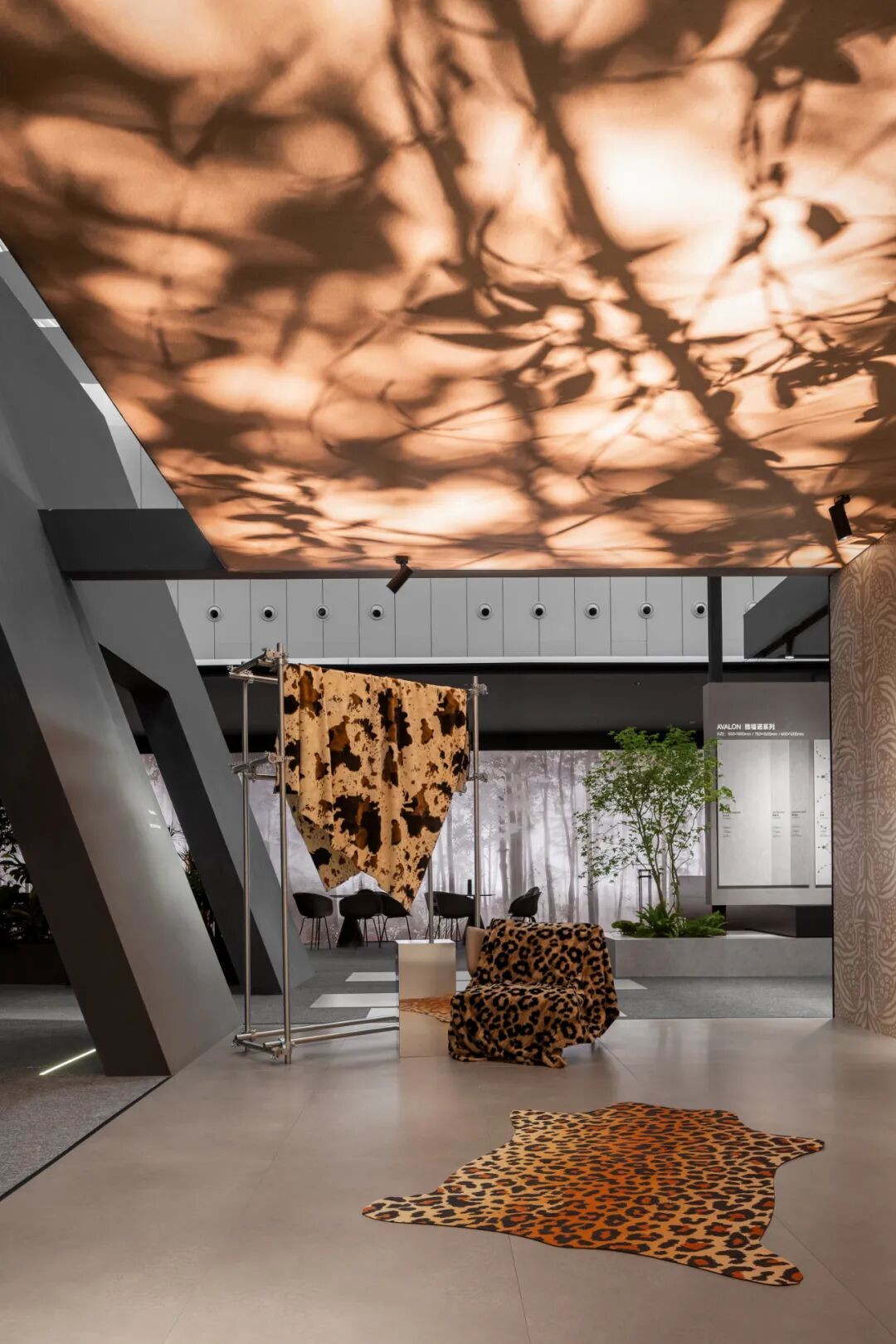 顶部的树影光幕模拟丛林光线穿透叶隙的呼吸感。陈列架上的皮革与地毯直接的触觉体验,与地砖上隐约的豹纹肌理形成触觉与视觉的双重体验。