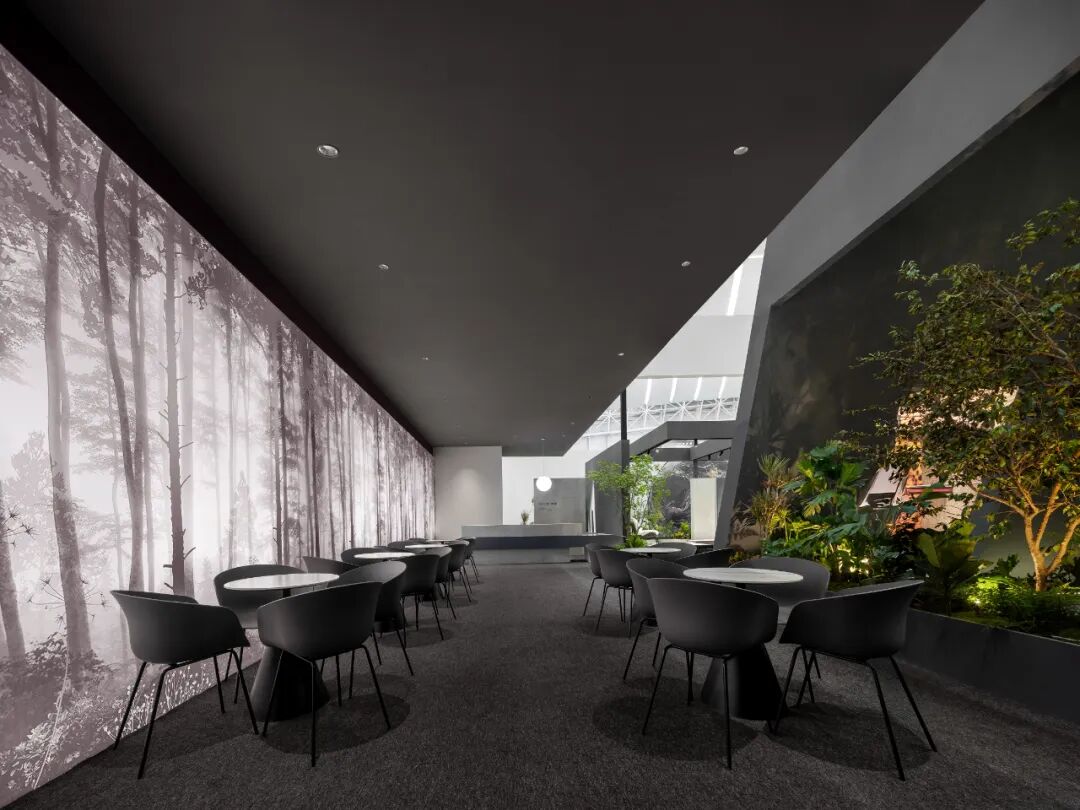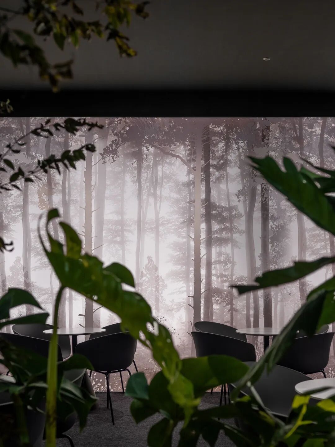 越过野性展区,巨幅云雾森林画面晕染出空间休闲洽谈区域并连接两个主题展区。
