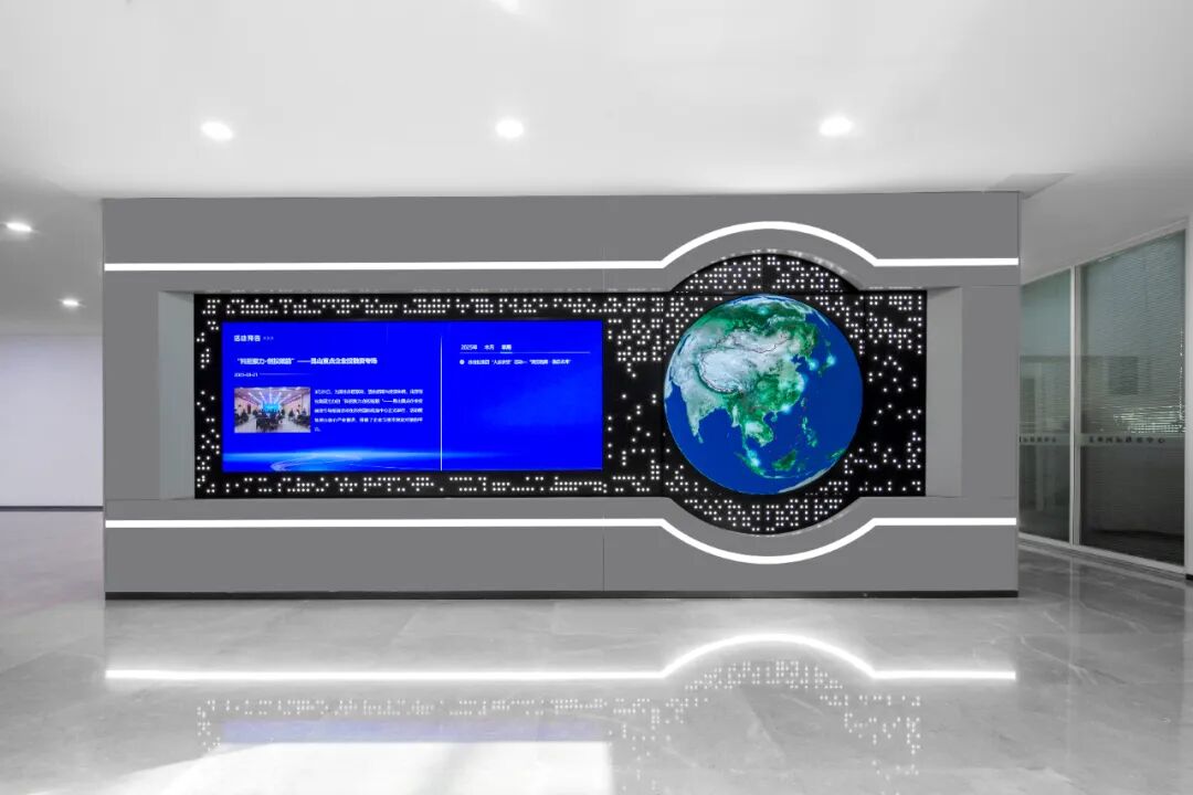 墙面采用双屏联动设计,用户可以通过点击地球上的点位,展示对应项目的发展特色。这一交互设计具有多重功能: