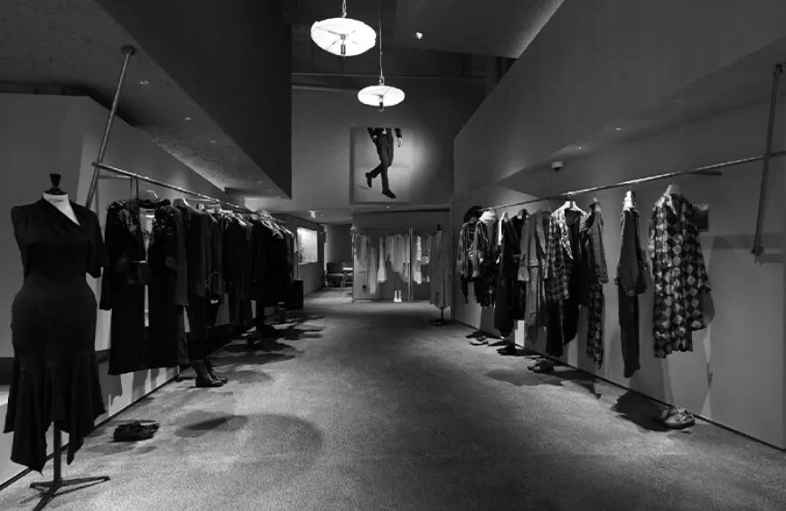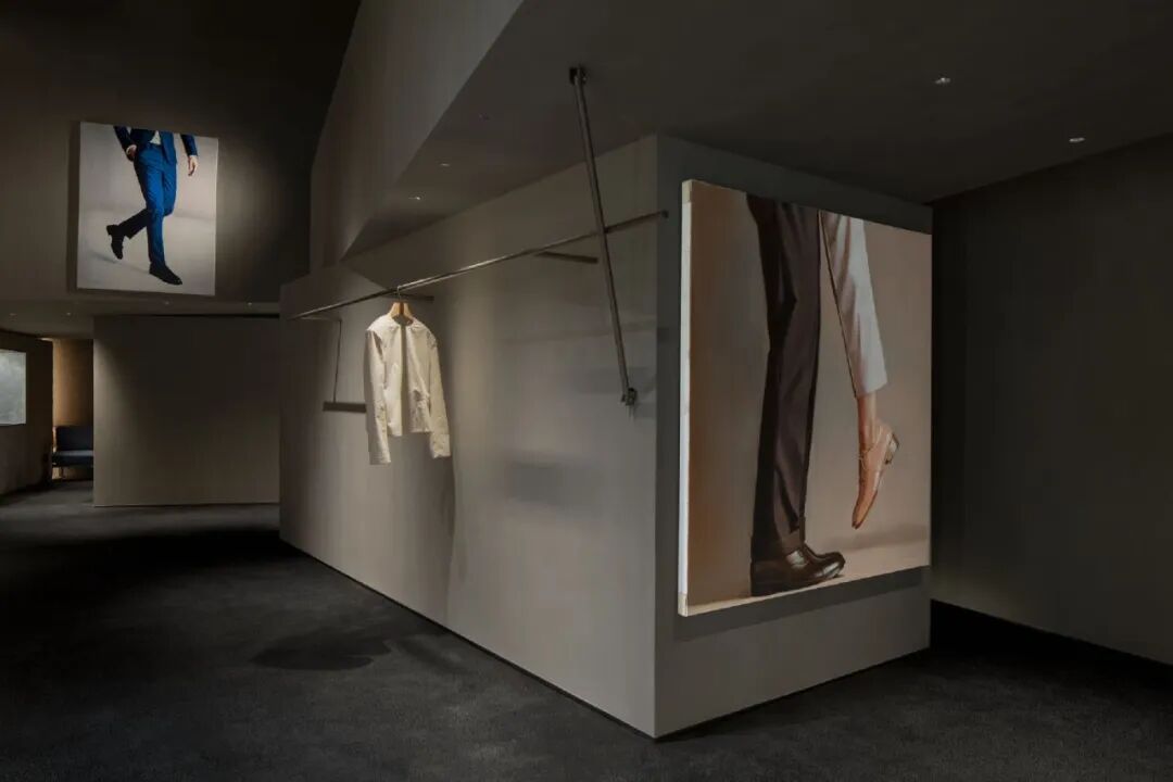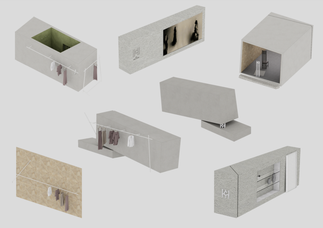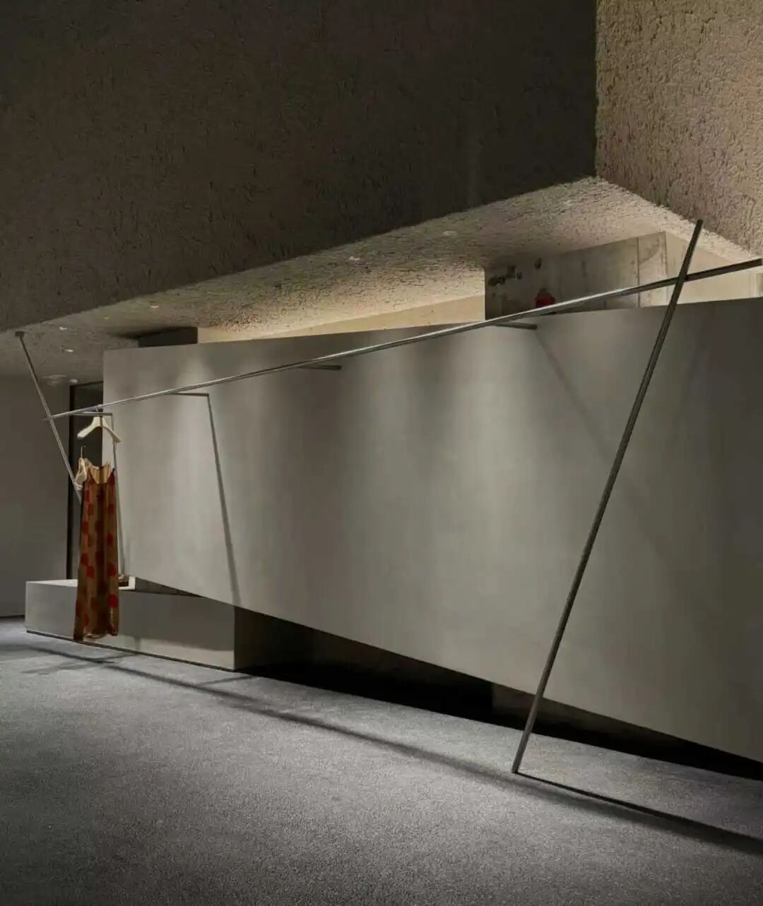 The space employs grey rough-textured Rophy rock or matte micro-cement for different stone blocks, creating a rich tactile hierarchy within the structural composition. Metal rods serve dual purposes: providing structural support while also functioning as hanging rails for garments. This integration transforms clothing racks into a cohesive structural system, elegantly showcasing the refined collections on display.