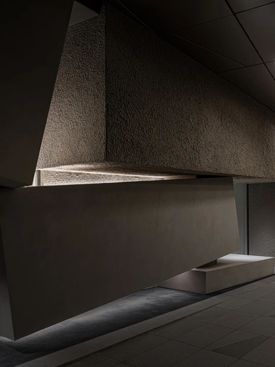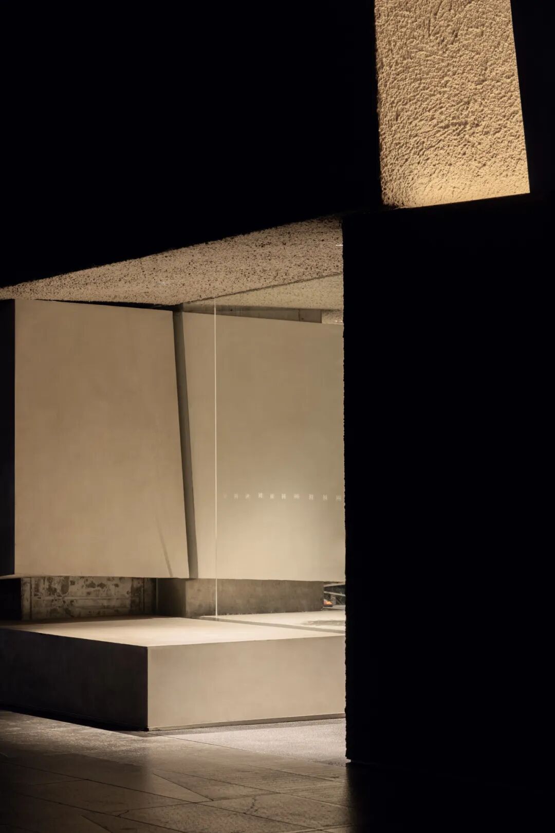 夜幕降临后,光线通过石缝之间散出,洞穴般的空间被温暖的光线所照亮,在充满玻璃幕墙的城市界面中营造出神秘且原始的空间氛围。