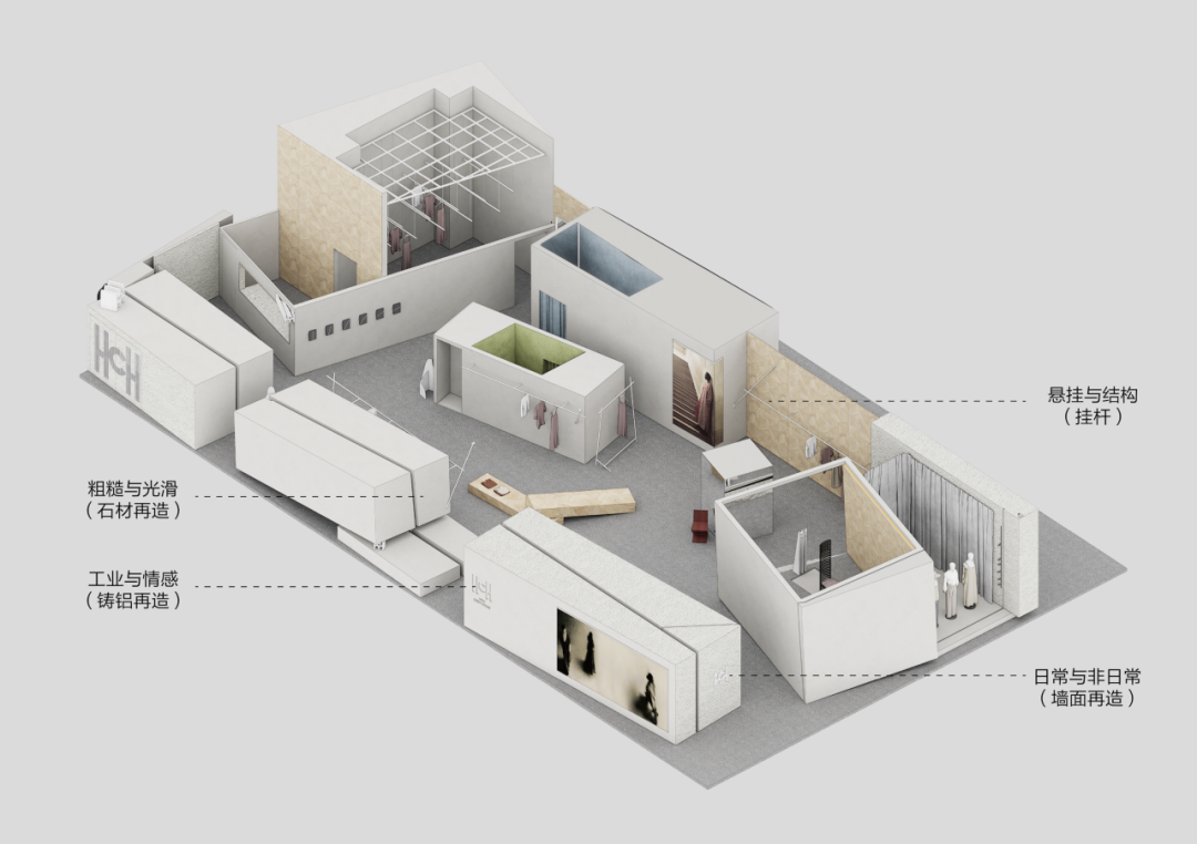 HCH Greystone Concept Store is a unique and captivating multi-functional space located on the first floor of Wuhan MixC, covering approximately 290 square meters. Centered around the theme of "rock crevices," the design responds to people's innate need for spatial exploration. By integrating stone with fashion, art, home living, events, and other diverse scenarios, it creates an environment filled with curiosity and a desire for discovery.