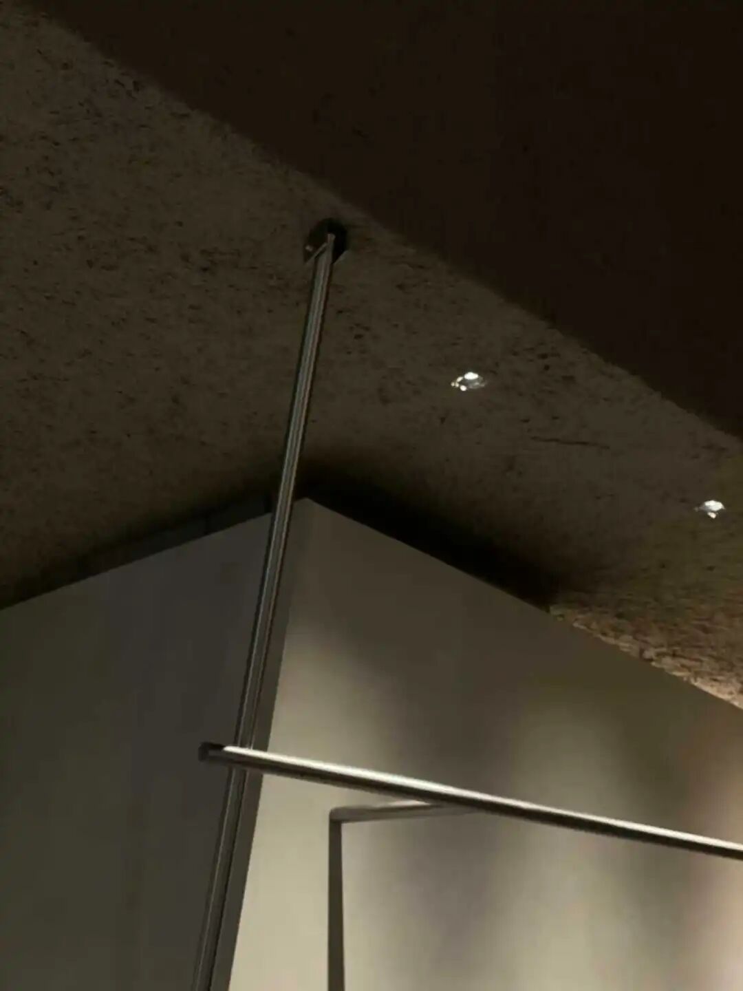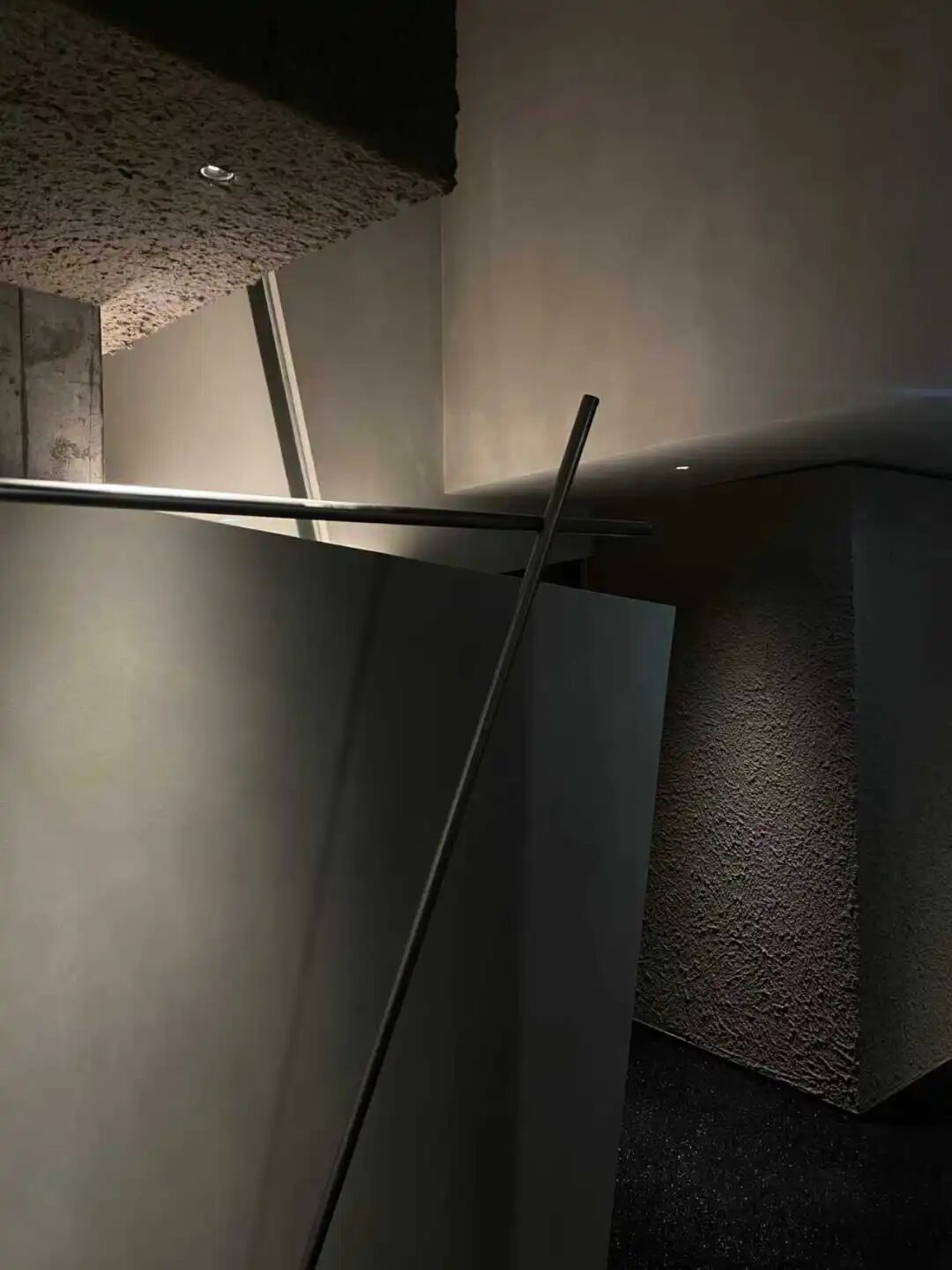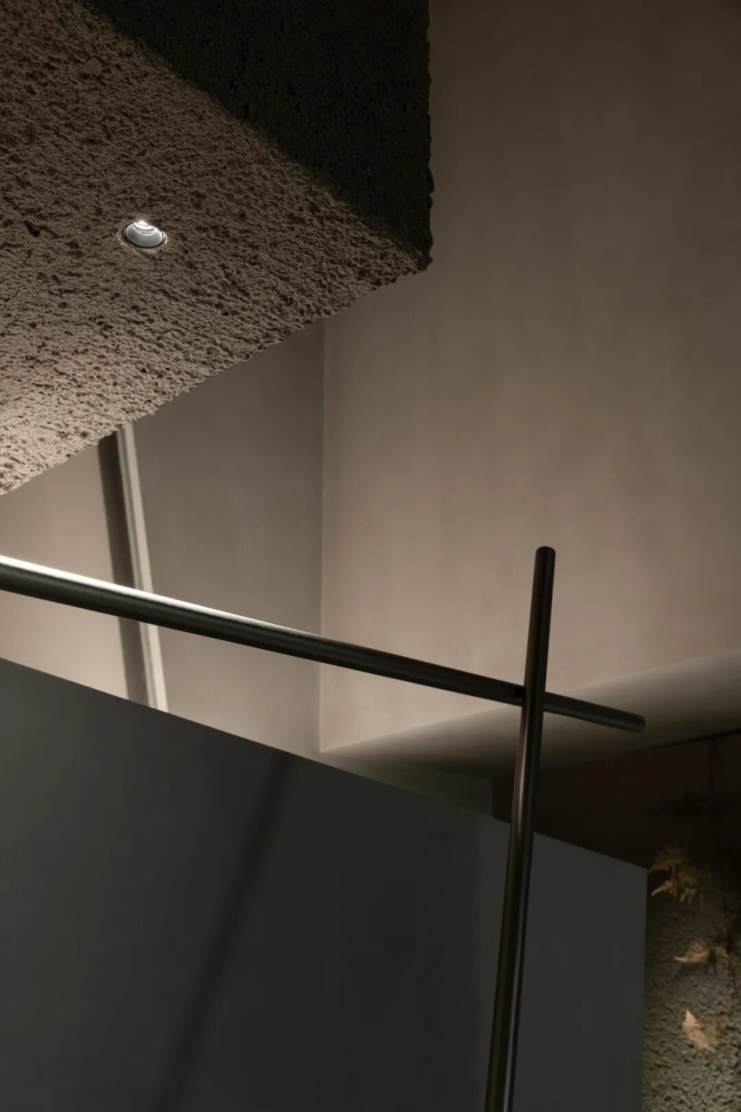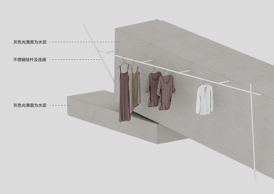 不同的石块采用了灰色糙面罗非岩或哑光面微水泥的表面质感,结合触感让空间结构呈现出质感层次,金属杆件作为结构支撑的同时可悬挂物品,让挂衣杆形成结构体系,展示出精致的作品。