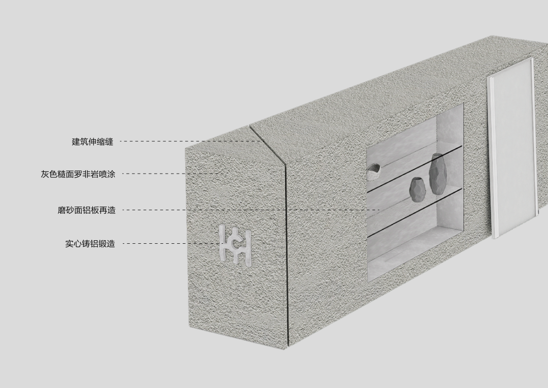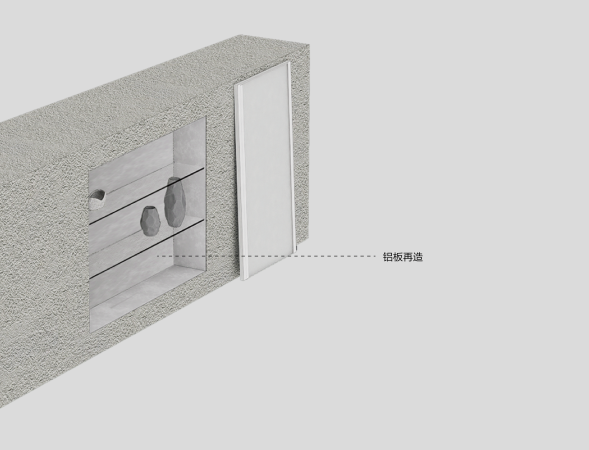 与我们对常规铝板在日常中认识不一样的是,摈弃铝板原始精致/易维护的原始属性,刮擦所形成的痕迹本身被认为是不美观的,而我们将此放大,形成与石头厚重质感相匹配的明亮的,带有反射感的表面肌理。