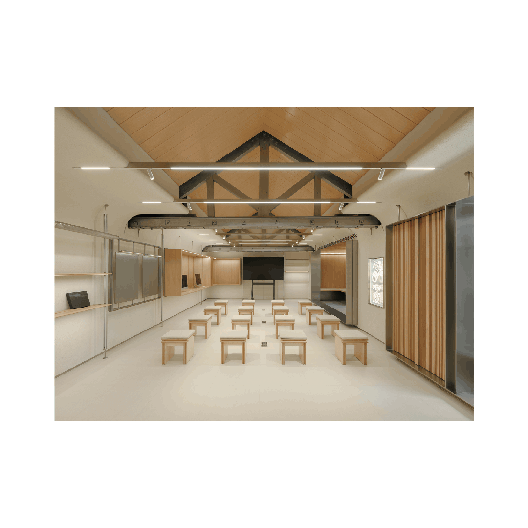直营店三楼的工作坊在扩建后被巧妙划分为前后两个区域:前区呈扇形布局,可用于小型活动和聚会;弧形天花布帘轨道从入口延伸至后区,柔和地分隔了前后空间。配合可灵活移动组合的座椅,工作坊能够根据实际使用需求轻松调整布局。