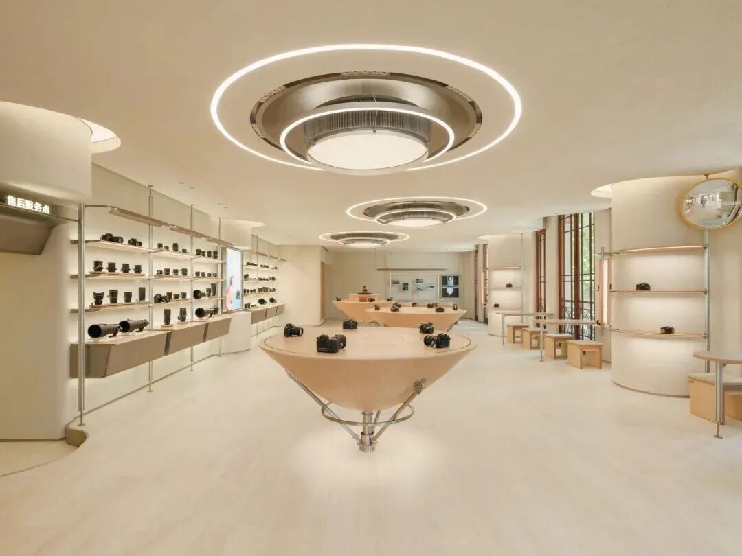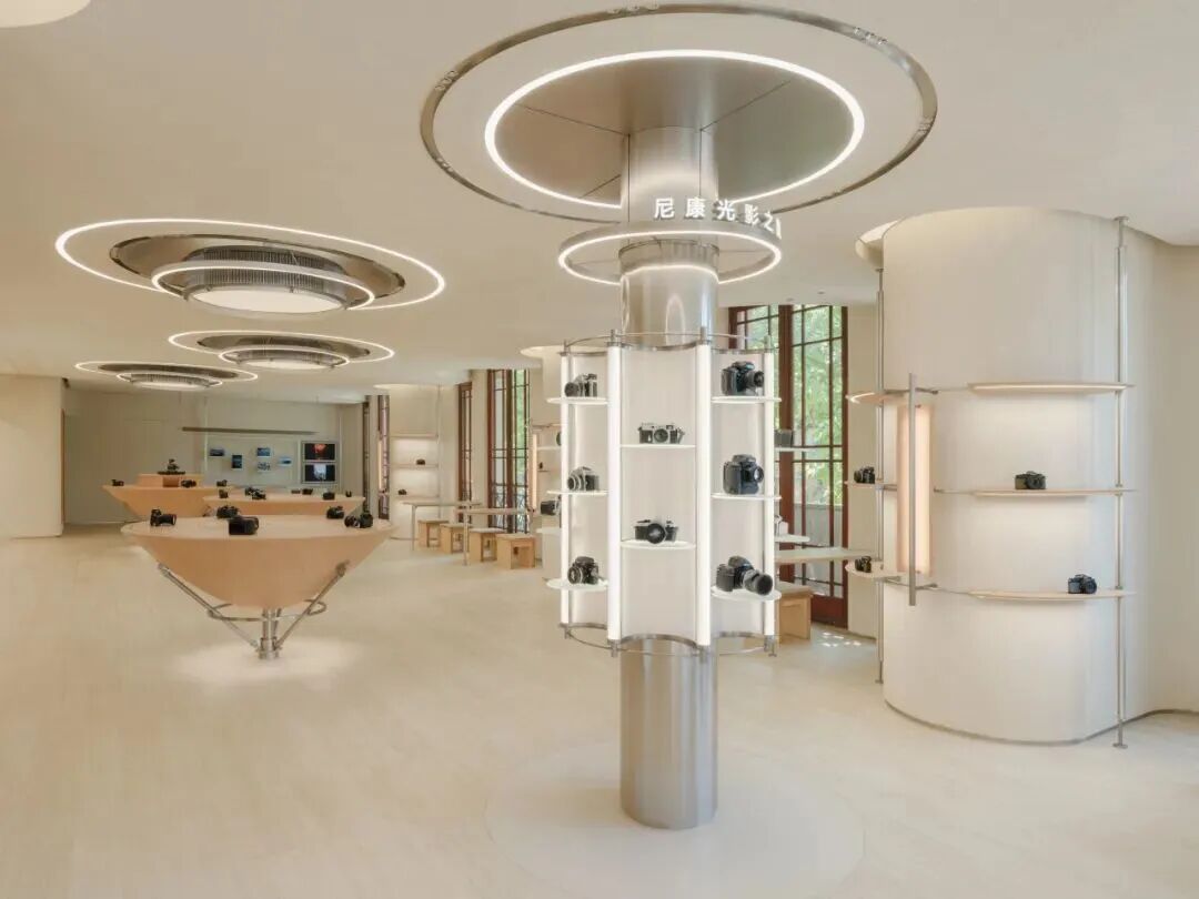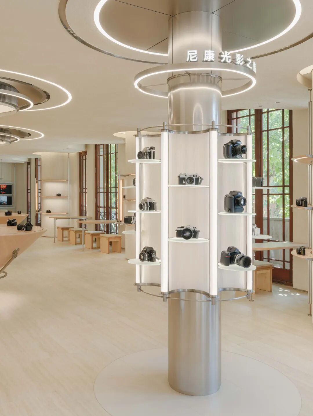 At Nikon Shanghai, natural and artificial lighting is arranged according to walls, props, and functional zones, shaping layers and atmosphere to convey the theme “Light is the soul of photography.” Curved props and varied textures are customized to match the products, reflecting Nikon’s pursuit of quality in the details.