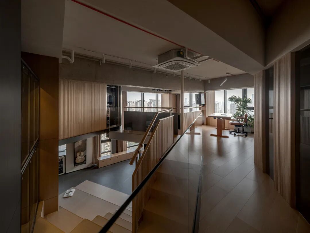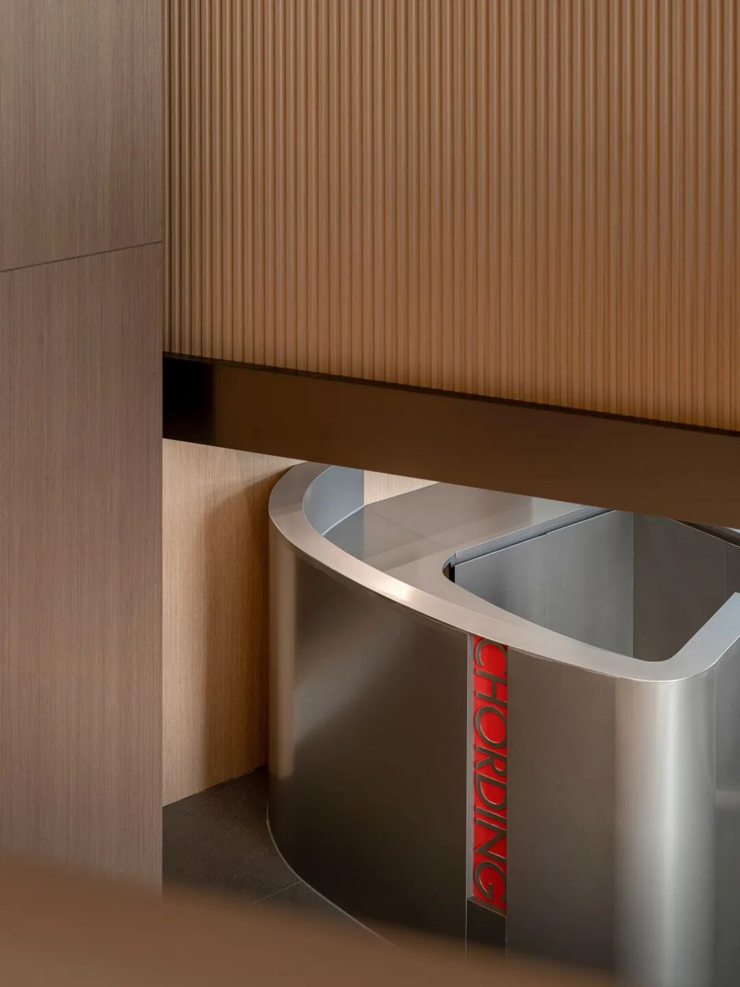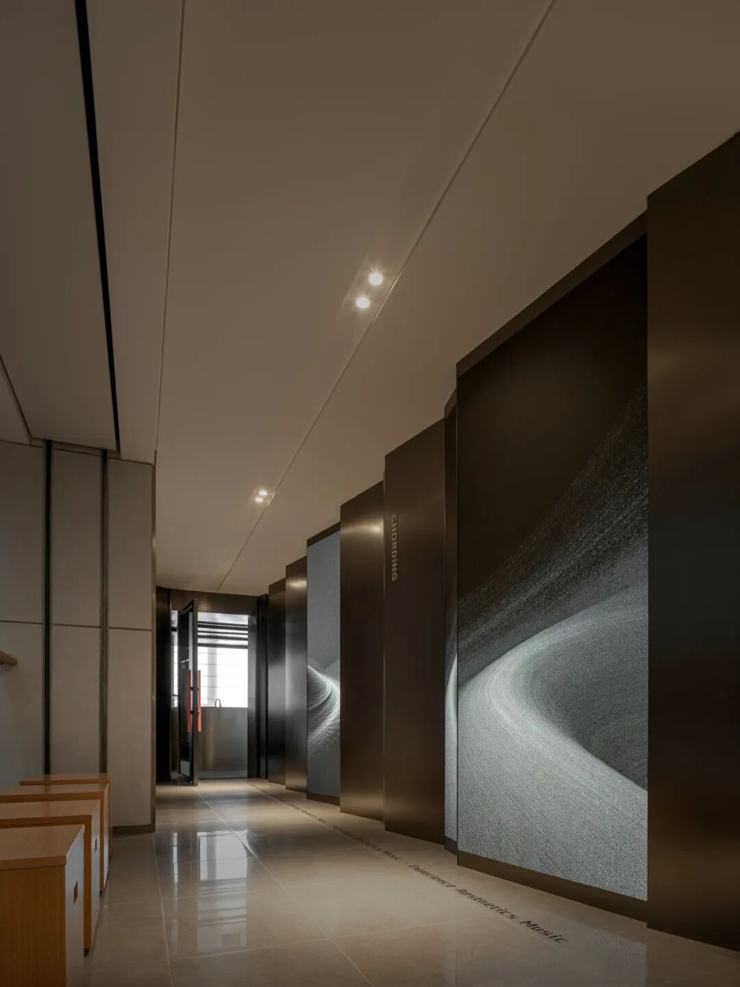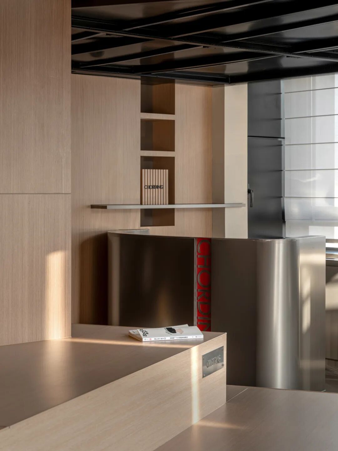 由于层高的局限,我们在设计中大量使用纵向语言,强化空间的拉伸感。纵向的秩序感在视觉上冲淡了层高限制,让空间显得更开阔与自由。