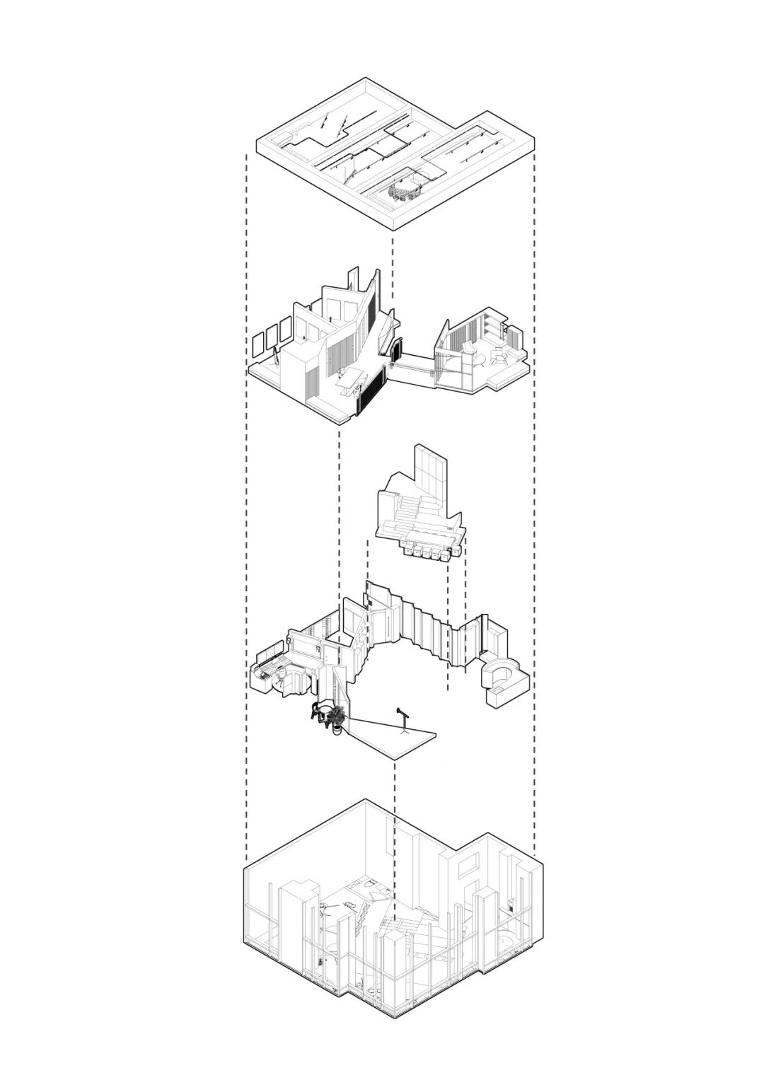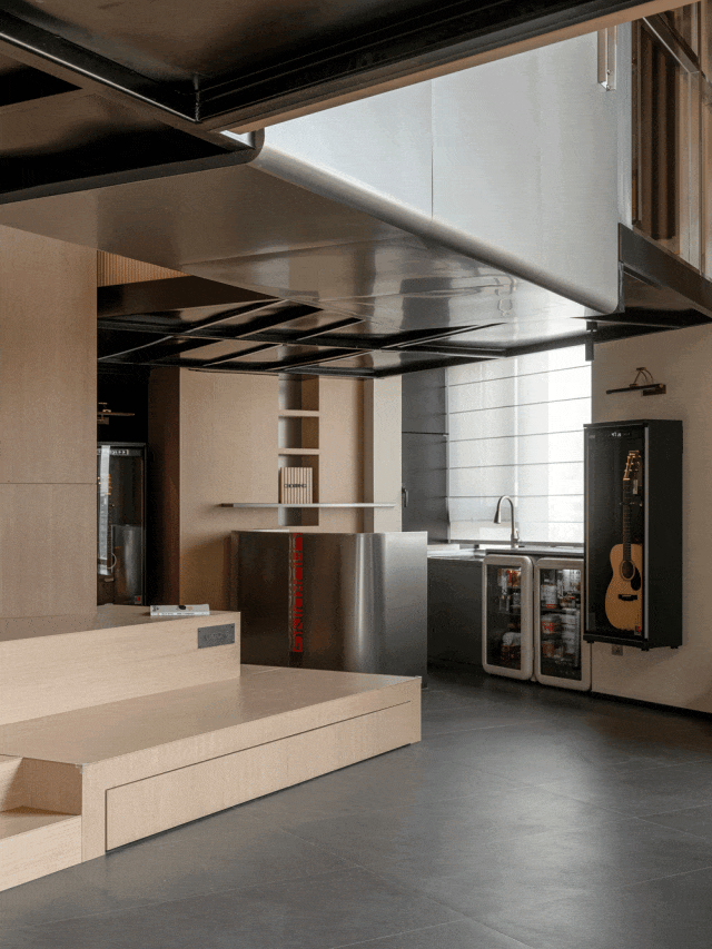The core transformation was to retain the double height while adding new mezzanines. A stage with two window views became the focal point, creating a centripetal field. Here, the relationship between performer and audience was redefined, as all functions unfolded around the stage, turning the space into a small theater.