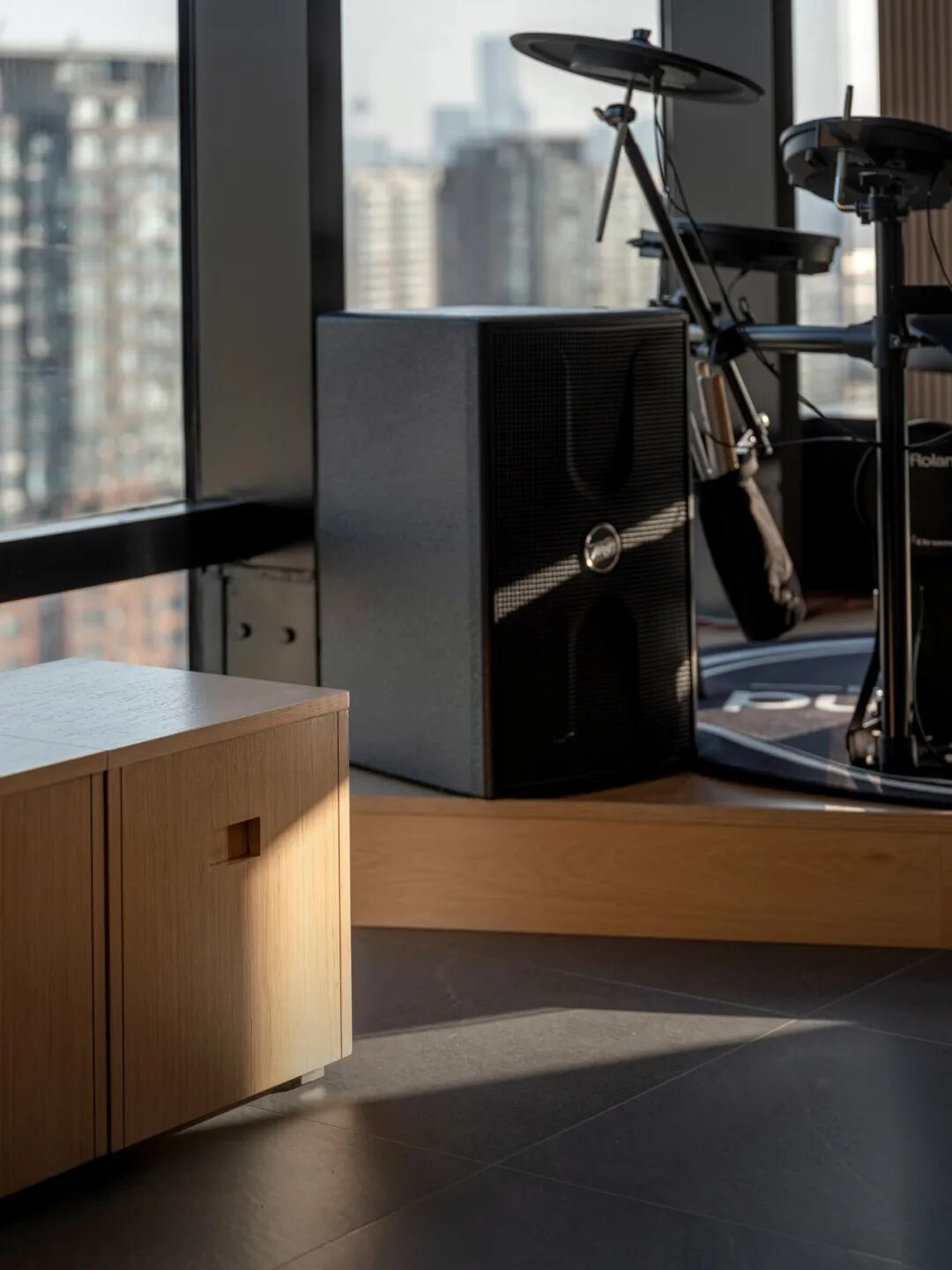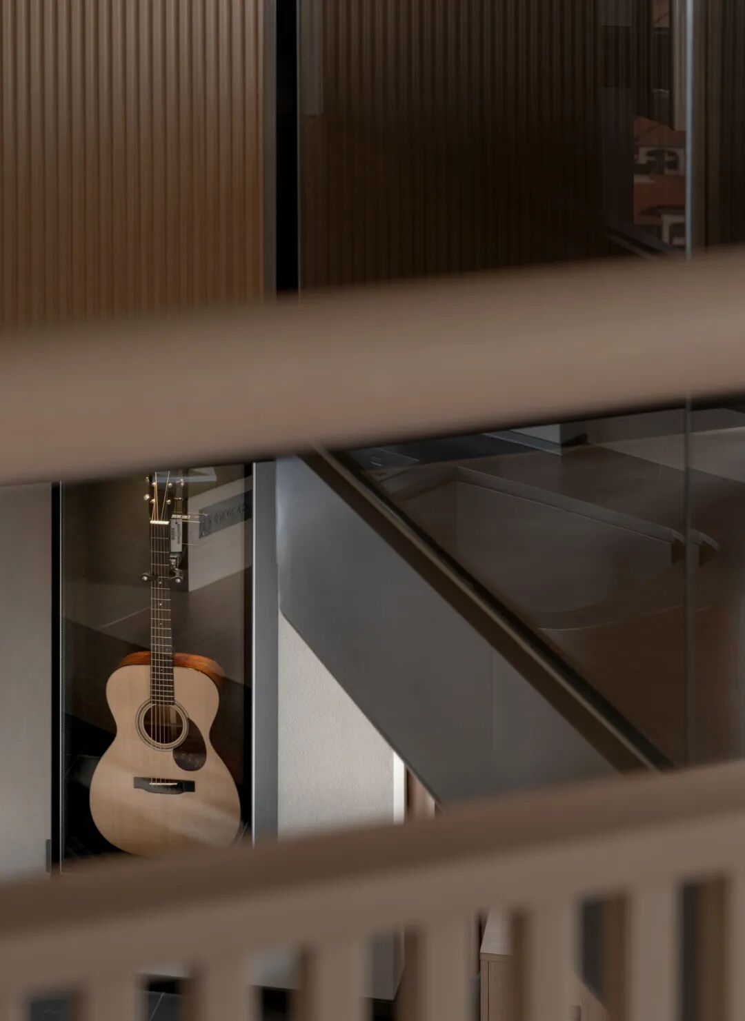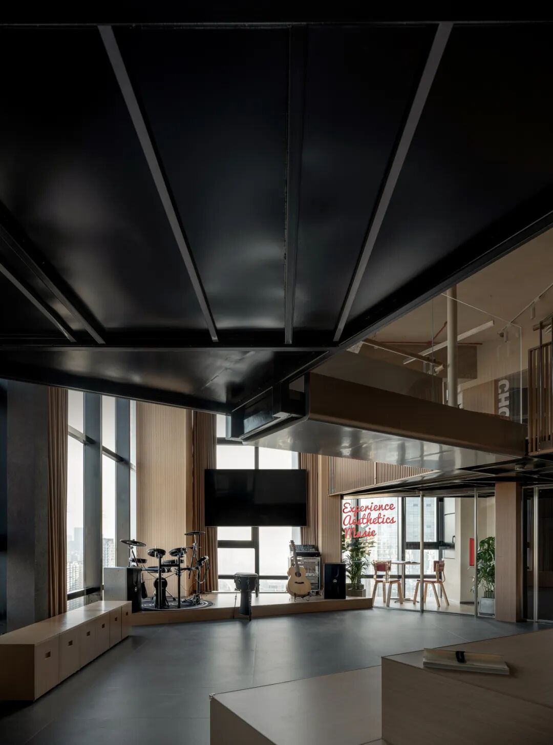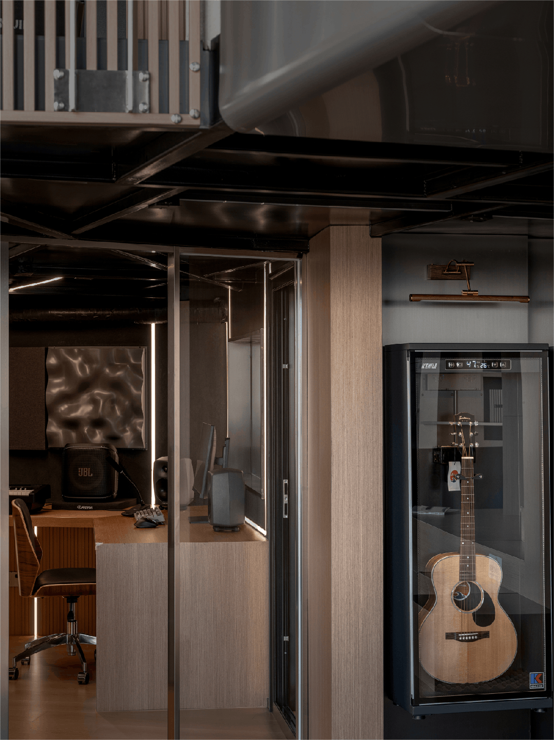 与此同时,我们也希望空间有温度。在教室和公共区,我们引入更亲切的家具和装饰,这里既是音乐人安心创作的场所,也是大众放松体验的空间。