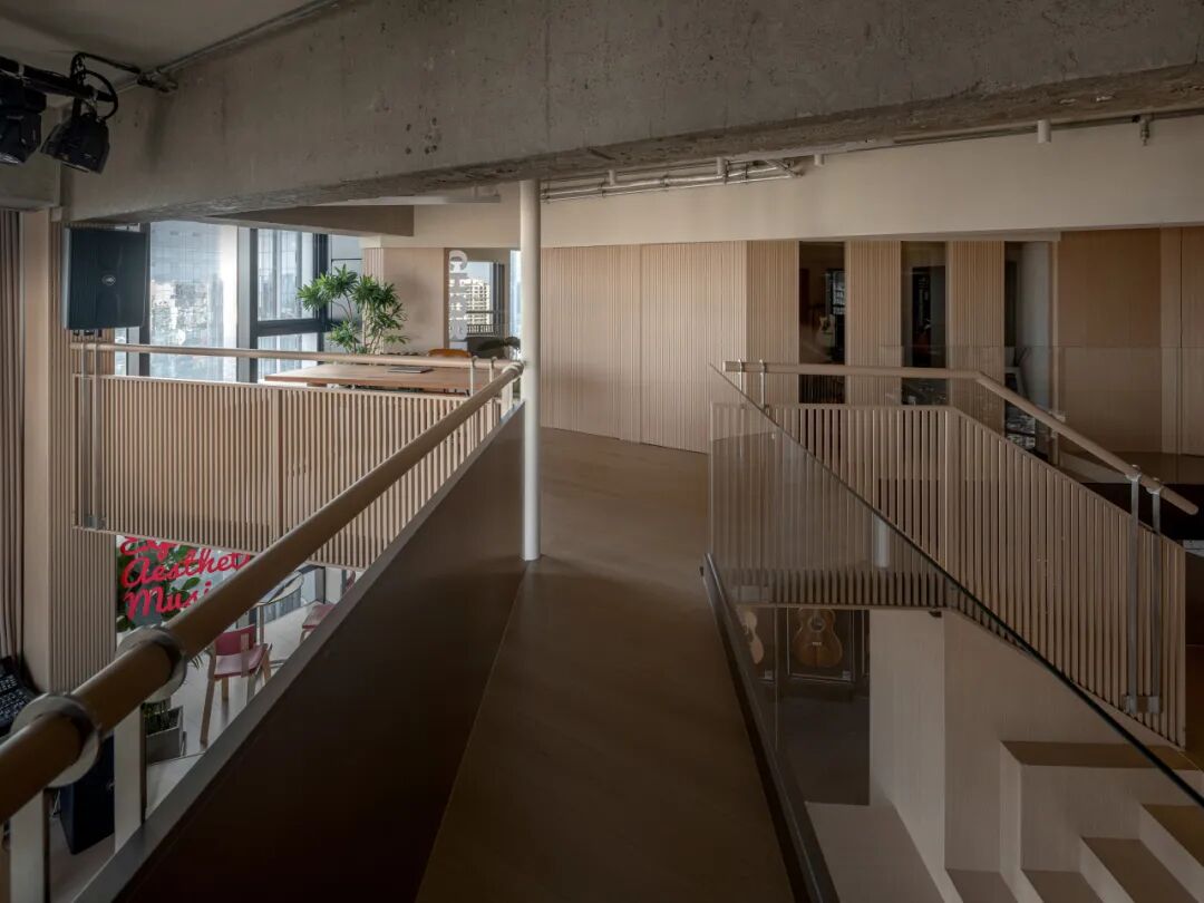 改造的核心,是保留挑空并增设楼板。具有两面窗景的舞台成为空间的中心,形成向心性场域。观演关系在这里被重新定义——四周的功能区都围绕舞台展开,让整个空间宛如一座小型剧场。