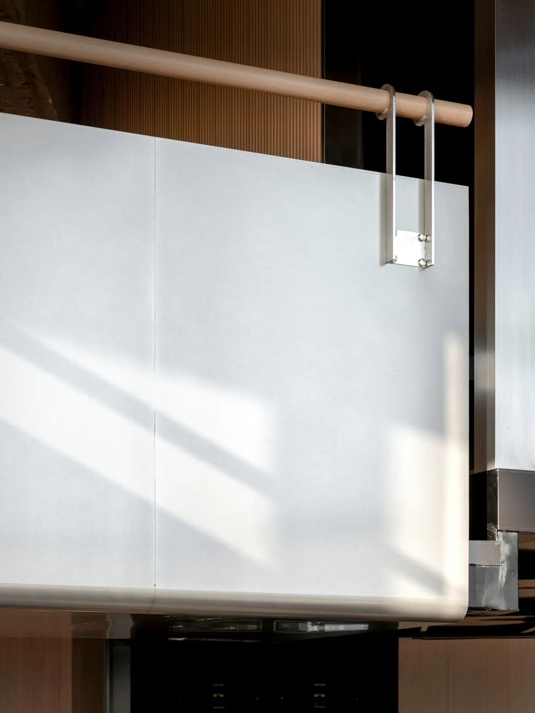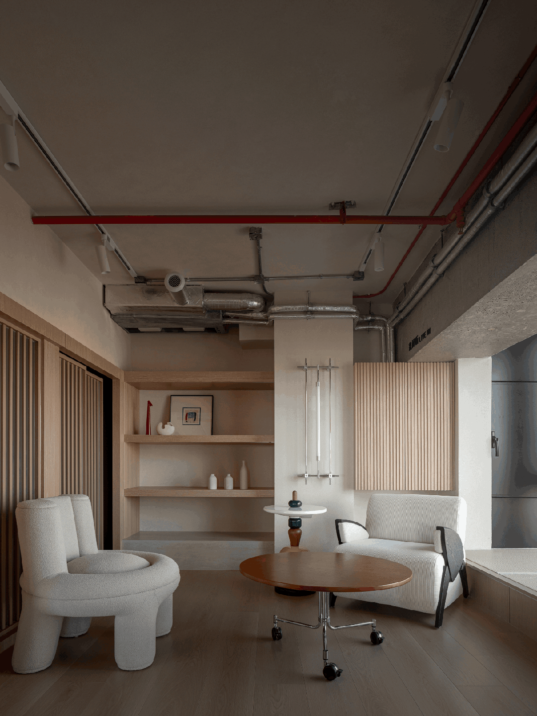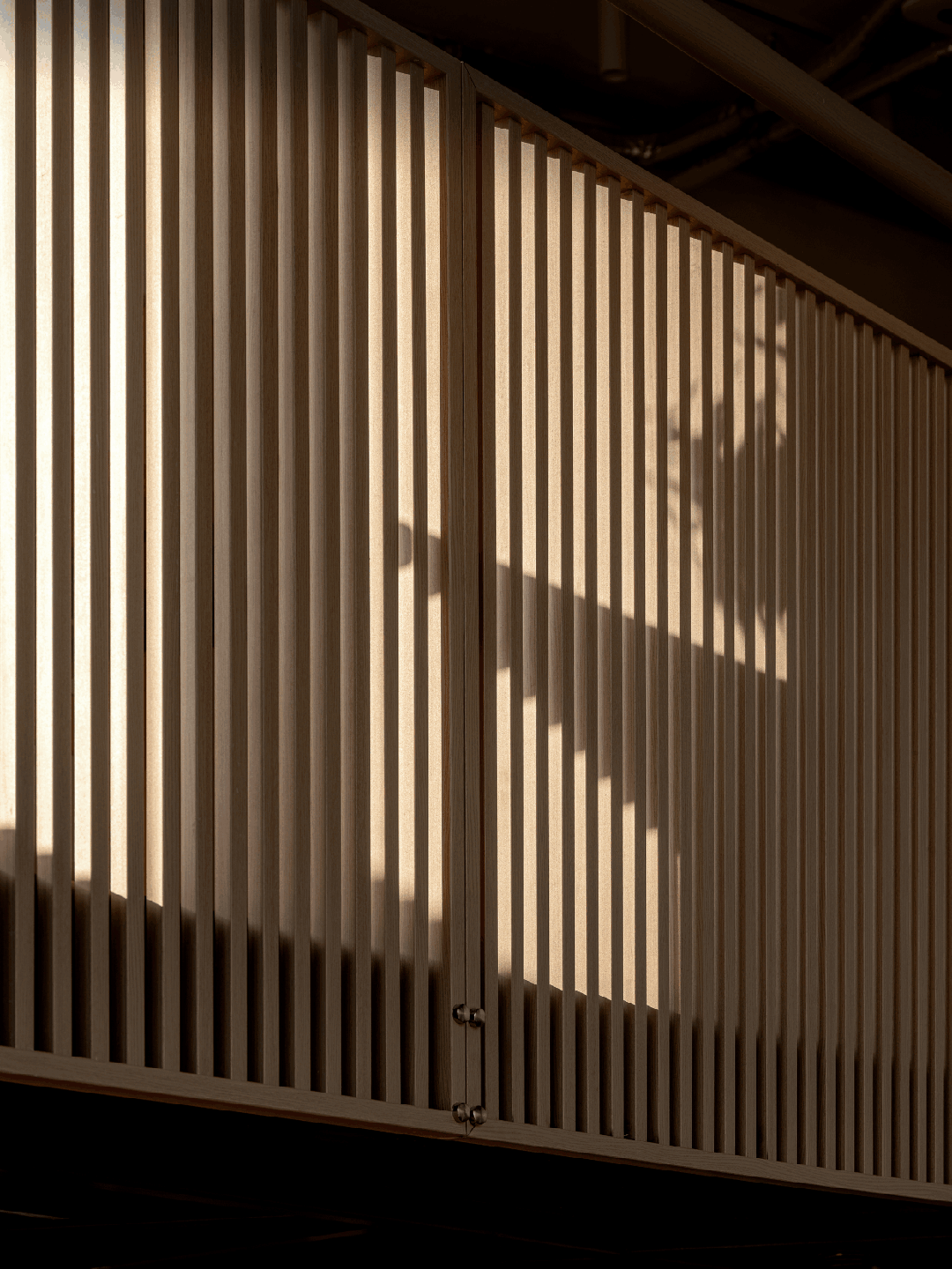 To counter the limits of height, we used strong vertical gestures to create a sense of stretch. This vertical order softened the constraints of the beams, making the space appear more open and free.
