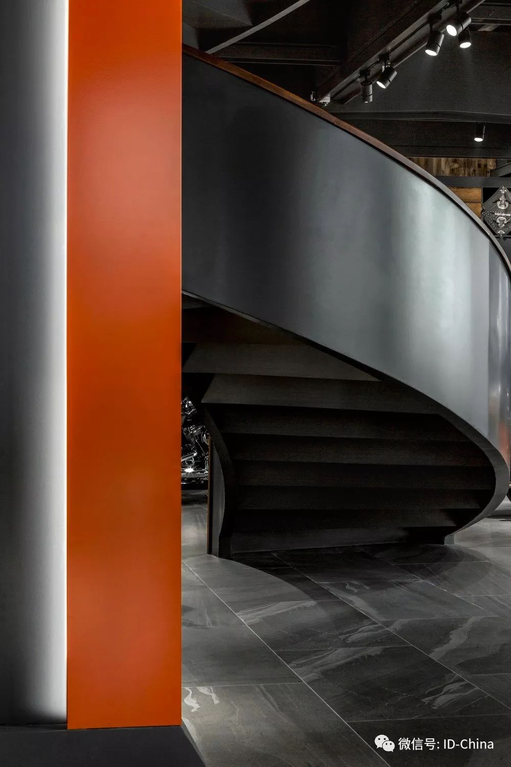 从核心区辐射展示区、吧台区、陈设区、休闲区,沿楼梯到达二层,可通过三处挑空实现上下空间的衔接与交流,成为空间情绪的出口,增加趣味性和互动性,楼梯设计的灵感来源于机车排气的部分外形及轰鸣韵律,极具艺术美感的弧度、夸张的曲线、金属质感肌理成为空间器度的核心表达。