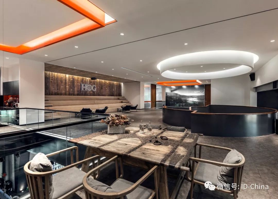 这是一栋独立建筑内部挑高为9.5米的大尺度空间,设计师把它分为两层,一层以哈雷机车和服饰、配件产品的展厅为主,二层为H.O.G.区和办公区域,在材质的选择上,除了建筑本身所需的混凝土钢结构以外,还搭配了一些天然的实木,木材来源于自然的生命,更好地为空间增加视觉上的温度,清水混凝土与木质相结合,突出机械的精美,对比鲜明,把哈雷机车金属的质感体现得淋漓尽致。