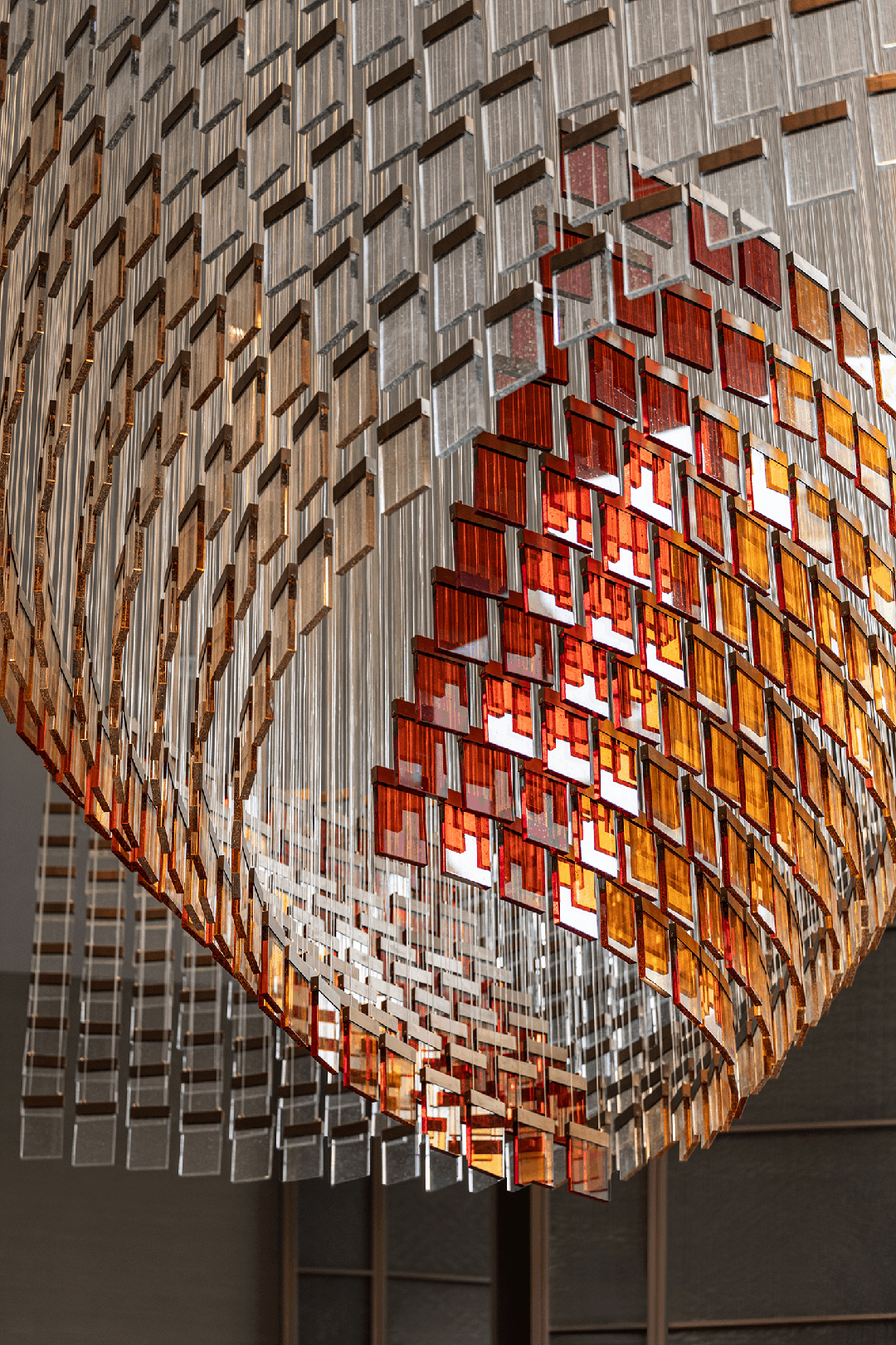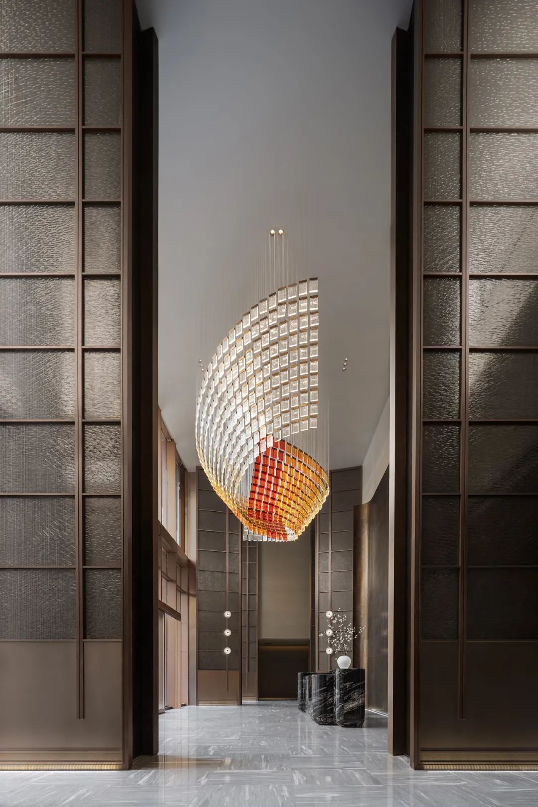 接待前厅悬挂的水晶吊灯,由彩色渐变水晶与金属网交织而成,流溢着如泉水般的流动之象,升腾向上之势与济南的“泉城”之名相契,颇有“虽由人作,宛自天成”的审美旨趣。