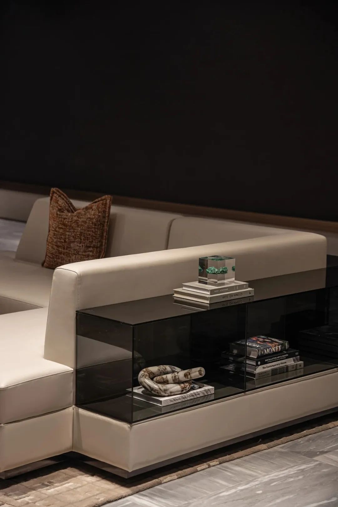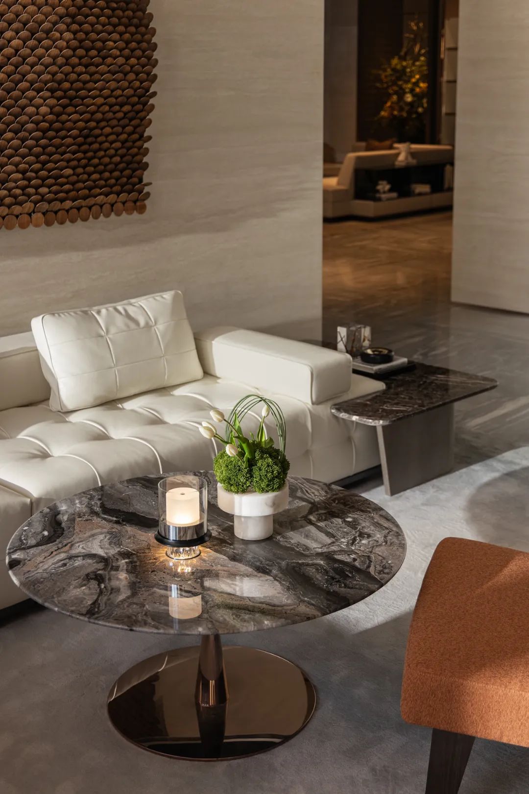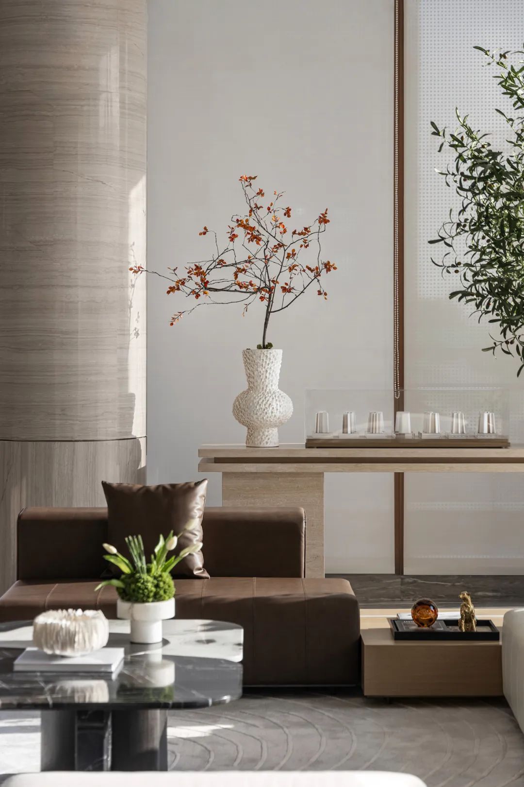 米白色皮质沙发、水墨写意茶几、高贵时尚地毯与精致艺术摆件,淡雅融合、色彩碰撞,奠定风流奢华的高阶生活。
