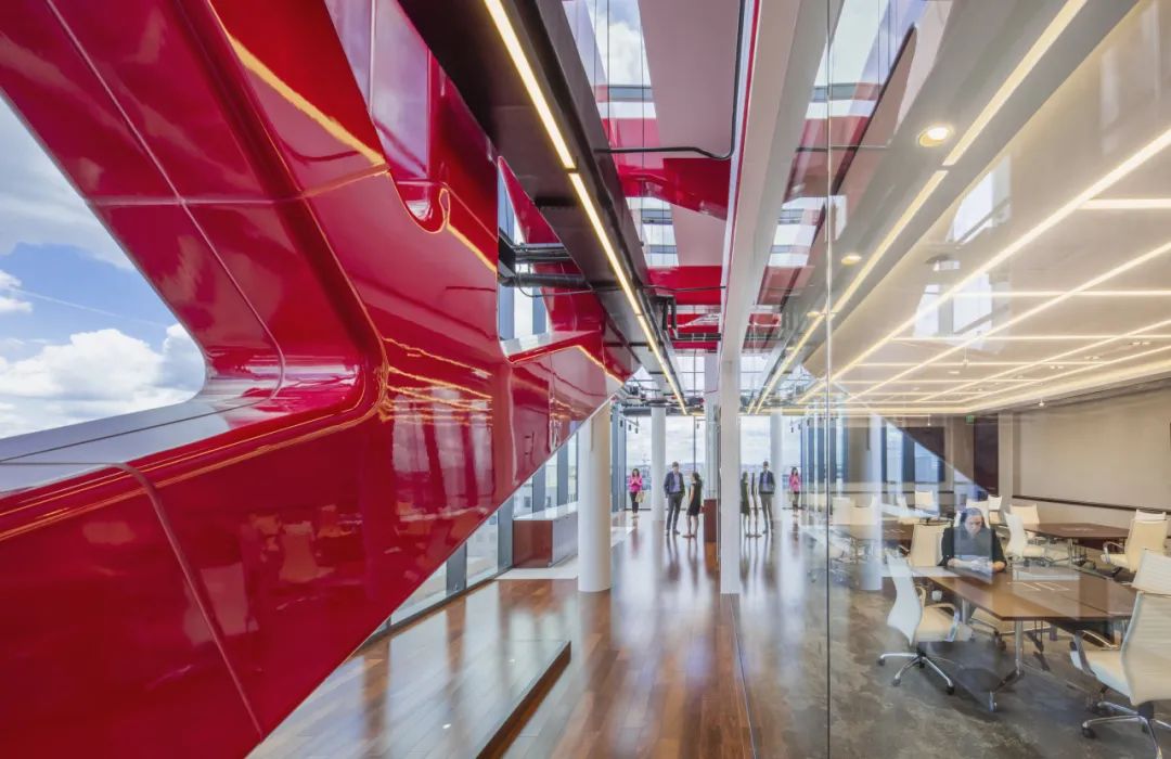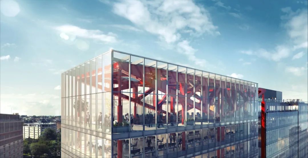 建筑主体被玻璃幕墙所包围,被标志性的“雕塑”元素环绕----一个12层的引人注目红色桁架。桁架不仅增加了建筑的趣味性,同时也承担了重要结构功能。该桁架在建筑顶部分为两个相等的部分,相距120英尺,位于幕墙后方,用于悬挂下面的九层,形成一个无柱的广场。