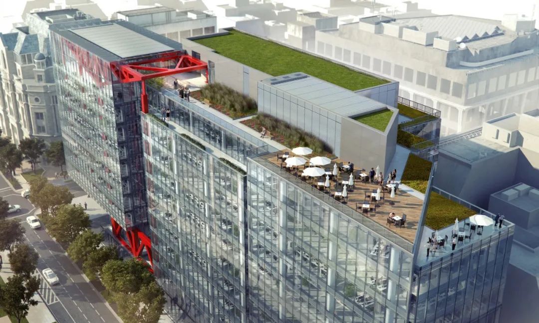 屋顶包括一个室内中庭以及外部的景观露台,让人们饱览无与伦比的华盛顿特区全景。景观露台与落地窗模糊了室内室外的边界,与独特的空调系统一同,引导人们前往户外空间。