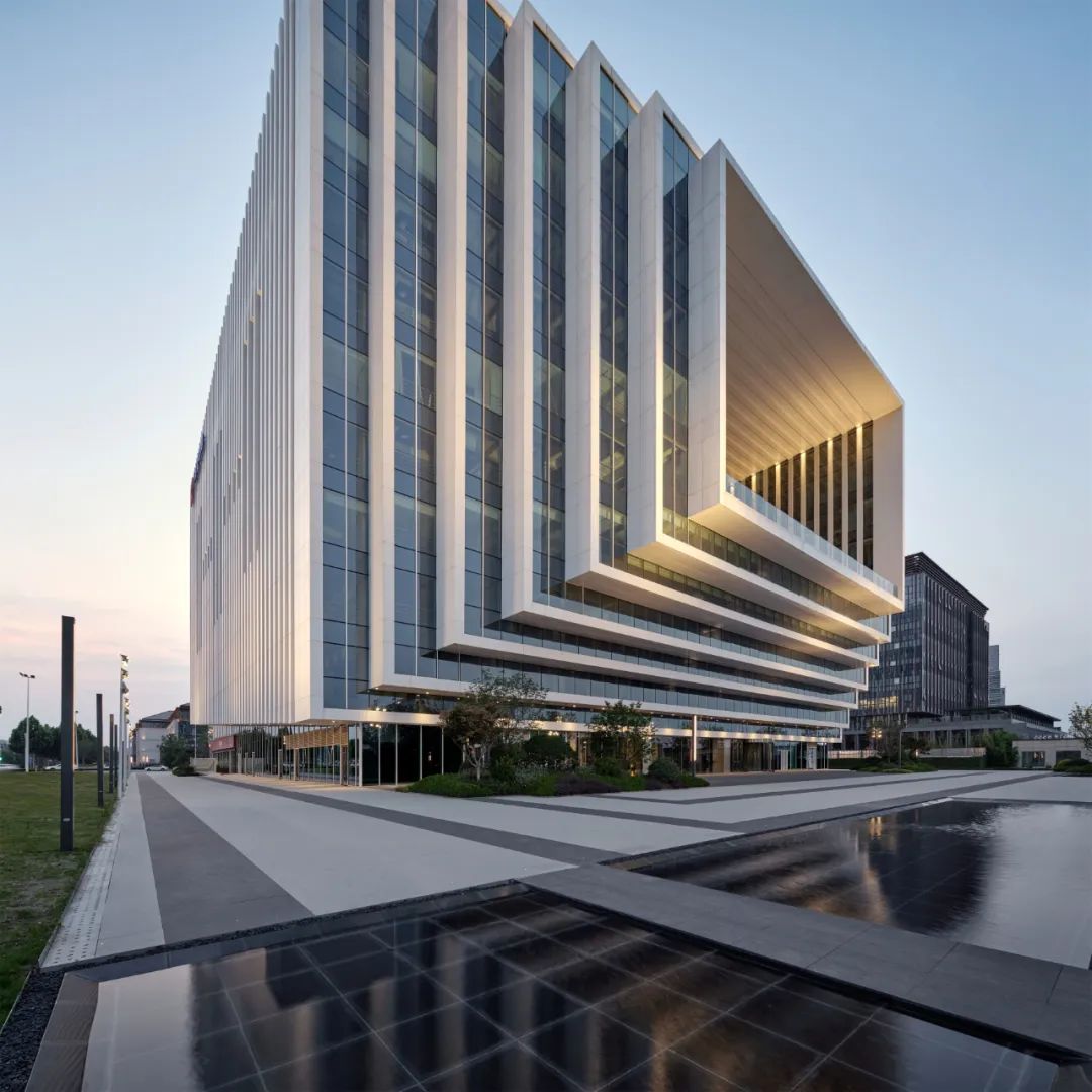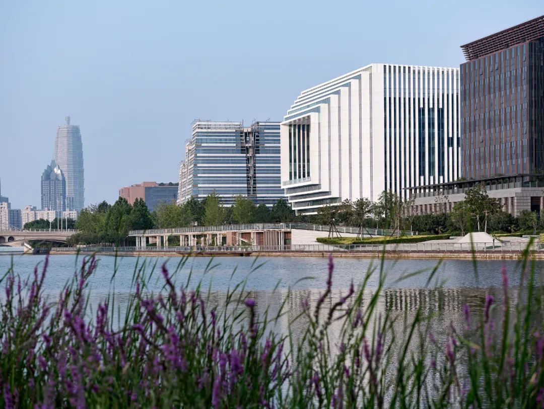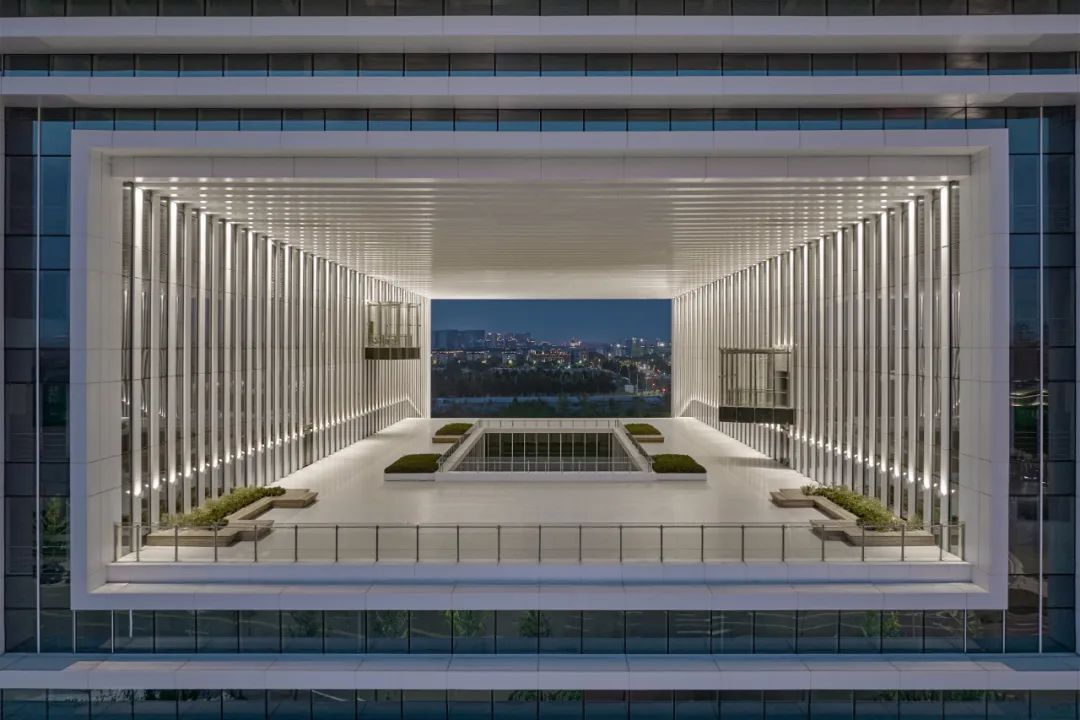 河南卢森堡中心位于郑东新区龙湖片区南部,如意河发展轴与中环路公共活力轴交汇处,受龙湖金融中心和郑东CBD双重辐射带动,项目兼具地标节点展示和轴线功能强化的双重属性。总用地面积13.65公顷,共分为五个地块,总建筑面积40.2万平方米,以时空多维、文化融合和平台共享为理念,采用筑地标、引街区、构环廊、营绿园的设计策略,形成双心引领、双轴成环、三区协同的布局模式,建设形成以“时空之窗”——龙湖国际中心和“千堡之韵”——卢森堡签证中心为人文特色地标节点,集国际化、复合化、生态化为一体的国际交流窗口、创新发展平台和生态人文街区多功能组团。其中,以国际商务金融总部办公为主的龙湖国际中心已建成投入运营,卢森堡签证中心预计将于2023年底完成建设。龙湖国际中心作为河南卢森堡中心项目的引领性地标建筑,坐落于北龙湖门户位置——1号地块,北侧临航空服务中心写字楼,南侧隔中环路与卢森堡签证中心相望,东侧为生态景观禀赋优良的如意河西岸,西侧与河南卢森堡中心的涉外服务中心、涉外商贸中心(4、5号地块)同轴排列。项目用地面积为11775㎡,总建筑面积为60036㎡,地上共11层为5A 甲级写字楼,地下2层为车库。项目将集聚郑州乃至河南的各类涉外资源,提升郑东新区龙湖组团国际金融商务服务区的营商办公环境,强化国际化程度和产业凝聚力。时空跨越 | Bridging Space & Time项目以“时空之窗”为设计理念,强调中西文化和中西商贸的古今文化跨越和时空穿梭。古代传统丝绸之路开启了中西商贸交流之路,现代空中丝绸之路则续写时空新篇,“四维空间”寓意时空穿越和时代进步。米白色渐变的竖向线条立面,配合高透的low-e玻璃,勾勒出简洁的空间形态。夜色下,建筑外置的动态回形灯光,呈现时空穿越动视。多维互动 | Multi-dimensional Interaction“回”字线条的造型设计,在给人跨越时空的视觉冲击外,更使得建筑与城市空间形成良好的多维互动。通过打通东西向建筑中部形成开放的中庭空间,片区内的东西向轴线从如意河滨一直向西延伸到4、5号办公及商业街区,形成空间上的对景关系,打造了立体化的人文活力街区。此外,内中庭设置的层叠阶梯及外挑的观景台,更是将优美的自然河景纳入建筑之中。