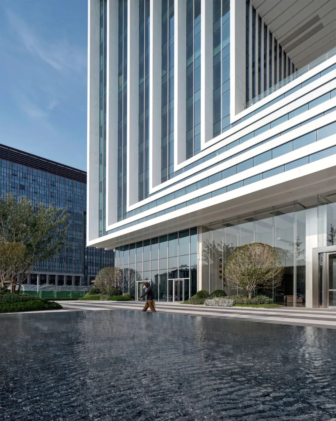 建筑整体布局结合区域环境,呈现向城市开放的特征。出入口前面均设置外部城市广场,其中西侧作为建筑主入口,设置二层挑高的大堂,强调入口的仪式感。基地东向开阔,且已有城市带状水系、植被等景观资源,故在西侧营造景观水系,形成东西景观的呼应。"回字型"平面布局彻底颠覆了办公建筑的闭合外形。建筑地上11层,其中1-4层以商业、餐饮、会议等办公配套服务功能为主,5-11层为具有开放共享平台的高端总部办公空间,地下2层为停车空间。