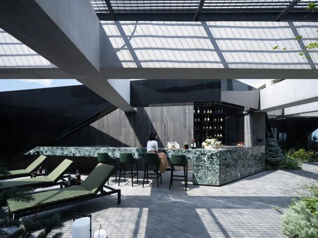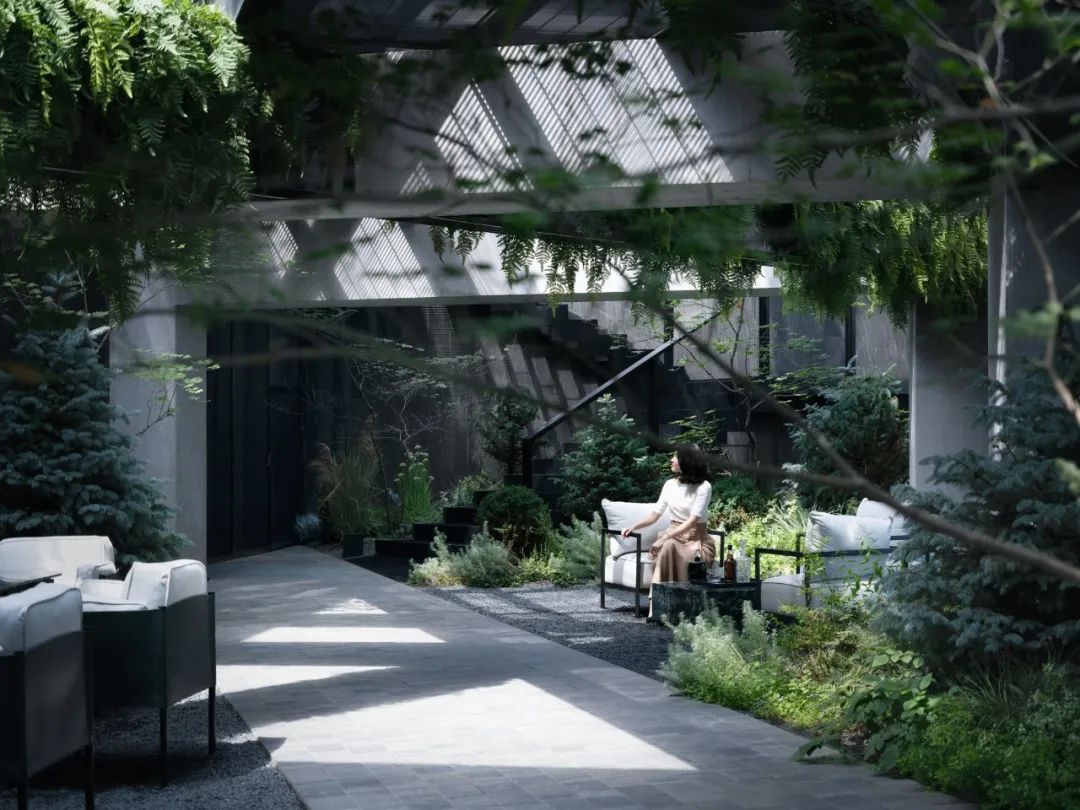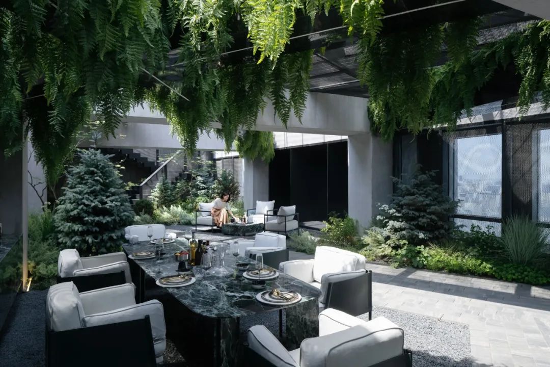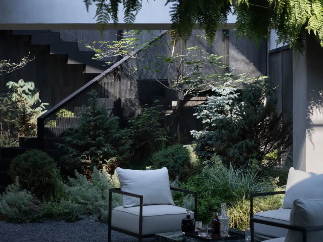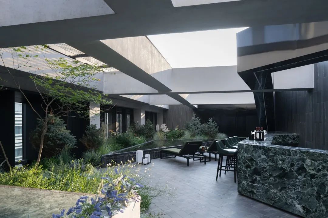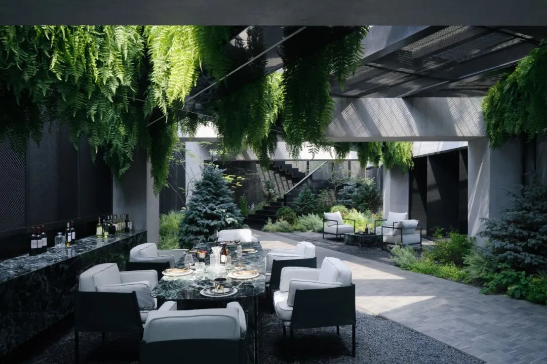 而另一侧根据风水要求,设置的枯山水观赏区。透过不同形式的片墙和框景,仿佛置身在不同的抽象山水画中,清新和艺术的氛围也能让使用者达到内心的宁静。Adjacent, a Feng Shui-inspired dry landscape viewing area emulates abstract landscapes. It creates various feature walls and frames, so the one feels like standing in a Chinese stroll painting. The delightful and artistic vibe nurtures inner tranquillity in return.在尽头的转角处,则是功能与黑苑类似的下沉会客区,墙面的巧妙设置让这个空间在兼具私密性的同时,又可以局部观赏自然的花园及身姿曼妙的庭院树。At the corner, a sunken reception area mirrors Heiyuan's charm, offering privacy and glimpses of the natural garden. 而楼上则是一个被自然种植包裹的露天聚餐烧烤空间,可容纳20人左右的聚会,漂浮在绿植上的大理石料理台,再次和原有的结构呼应。除了眺望远处的浑河及市中心的繁华,最独特的也在于每个花园都拥有一片属于自己的天空。On the upper floor, an open-air dining and barbecue space, enveloped by natural gardens, accommodates 20 guests. The marble cooking table harmoniously aligns with the original structure, providing scenic views of the Hun River and the bustling city. Its uniqueness lies in the gardens, each one a portal to the boundless expanse of the open sky, inviting nature's canvas to paint its masterpiece overhead.在植物的营造上,我们和魏玛再次合作,突破以往北方植物设计搭配相对固定,品种选择比较单一的限制,大胆采用了真假混植的方式,以达到饱满、自然的效果的同时,又符合北方寒冷地区生长要求。各个不同功能及区块对应其独特性格,也给出了不同的植物氛围。乔木的种植由于荷载和覆土的极限限制,每一棵的位置根据空间的框景效果精心选择,并单独抬升种植深度,以达到在精不在多的要求。Collaborating with Weimar, we defied