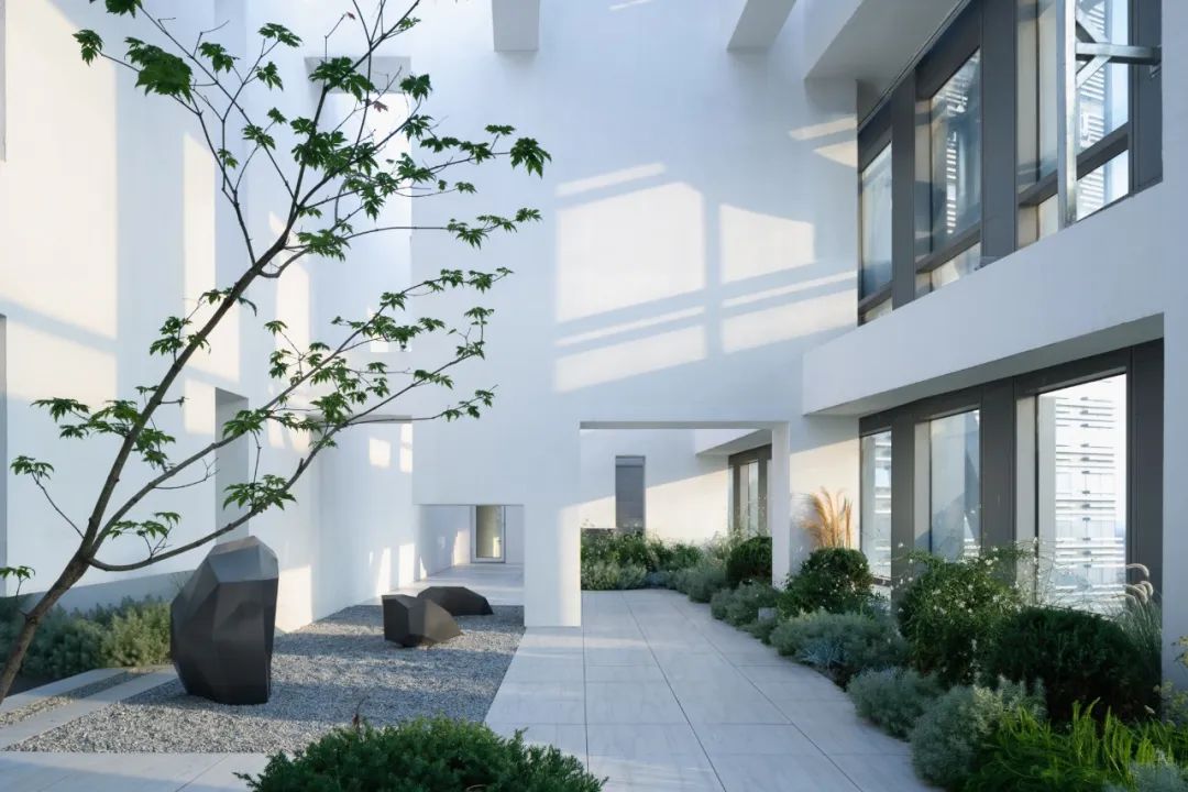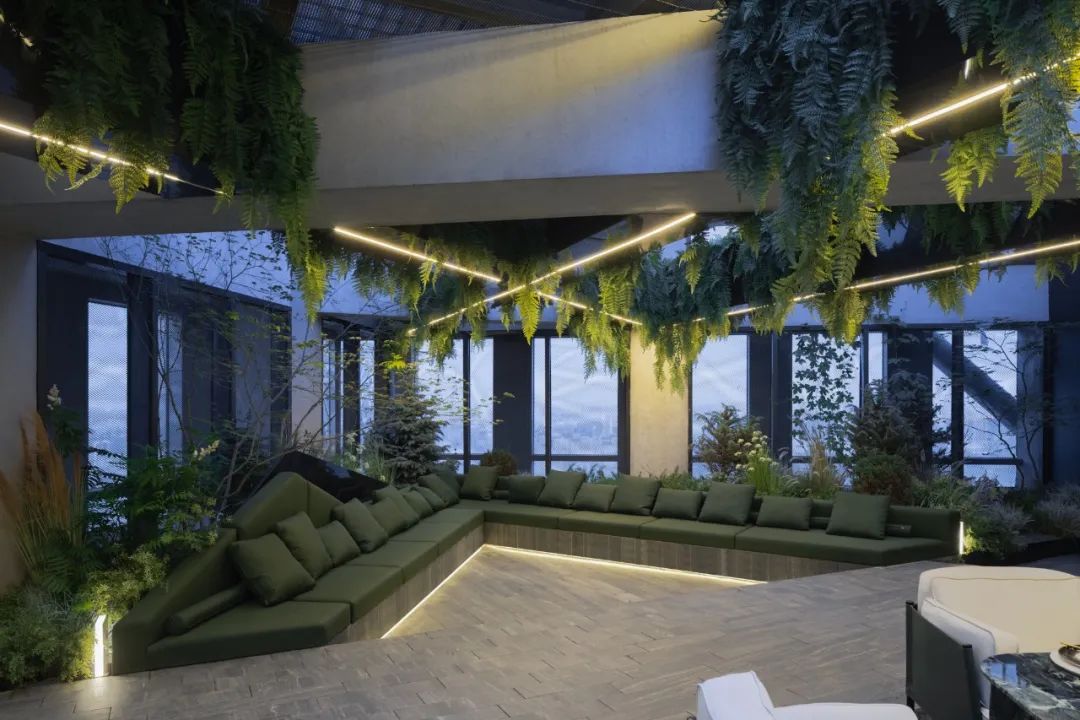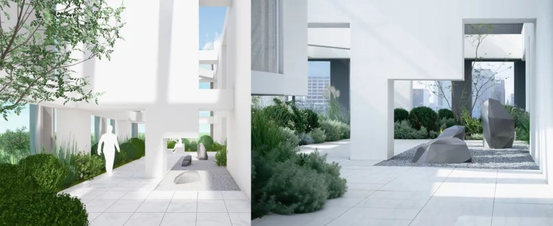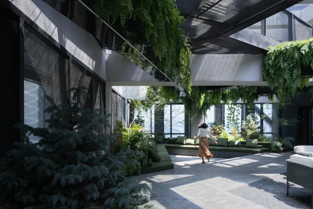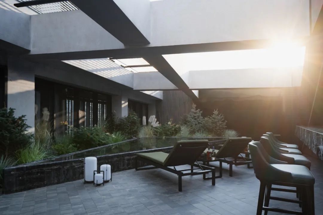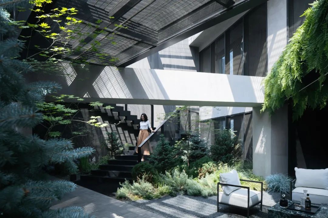 而另一侧根据风水要求,设置的枯山水观赏区。透过不同形式的片墙和框景,仿佛置身在不同的抽象山水画中,清新和艺术的氛围也能让使用者达到内心的宁静。Adjacent, a Feng Shui-inspired dry landscape viewing area emulates abstract landscapes. It creates various feature walls and frames, so the one feels like standing in a Chinese stroll painting. The delightful and artistic vibe nurtures inner tranquillity in return.在尽头的转角处,则是功能与黑苑类似的下沉会客区,墙面的巧妙设置让这个空间在兼具私密性的同时,又可以局部观赏自然的花园及身姿曼妙的庭院树。At the corner, a sunken reception area mirrors Heiyuan's charm, offering privacy and glimpses of the natural garden. 而楼上则是一个被自然种植包裹的露天聚餐烧烤空间,可容纳20人左右的聚会,漂浮在绿植上的大理石料理台,再次和原有的结构呼应。除了眺望远处的浑河及市中心的繁华,最独特的也在于每个花园都拥有一片属于自己的天空。On the upper floor, an open-air dining and barbecue space, enveloped by natural gardens, accommodates 20 guests. The marble cooking table harmoniously aligns with the original structure, providing scenic views of the Hun River and the bustling city. Its uniqueness lies in the gardens, each one a portal to the boundless expanse of the open sky, inviting nature's canvas to paint its masterpiece overhead.在植物的营造上,我们和魏玛再次合作,突破以往北方植物设计搭配相对固定,品种选择比较单一的限制,大胆采用了真假混植的方式,以达到饱满、自然的效果的同时,又符合北方寒冷地区生长要求。各个不同功能及区块对应其独特性格,也给出了不同的植物氛围。乔木的种植由于荷载和覆土的极限限制,每一棵的位置根据空间的框景效果精心选择,并单独抬升种植深度,以达到在精不在多的要求。Collaborating with Weimar, we defied