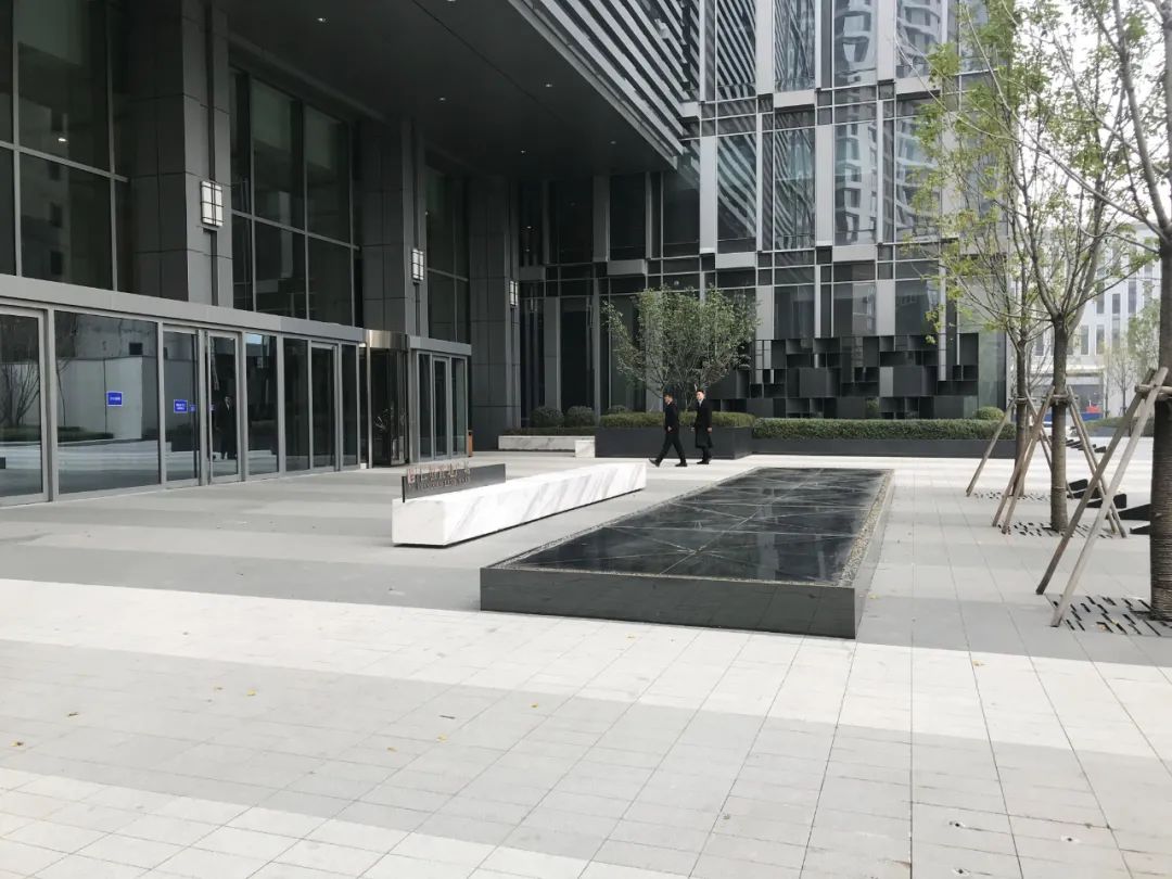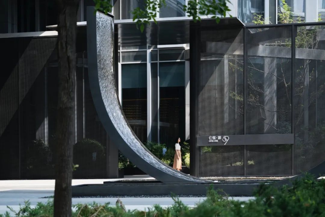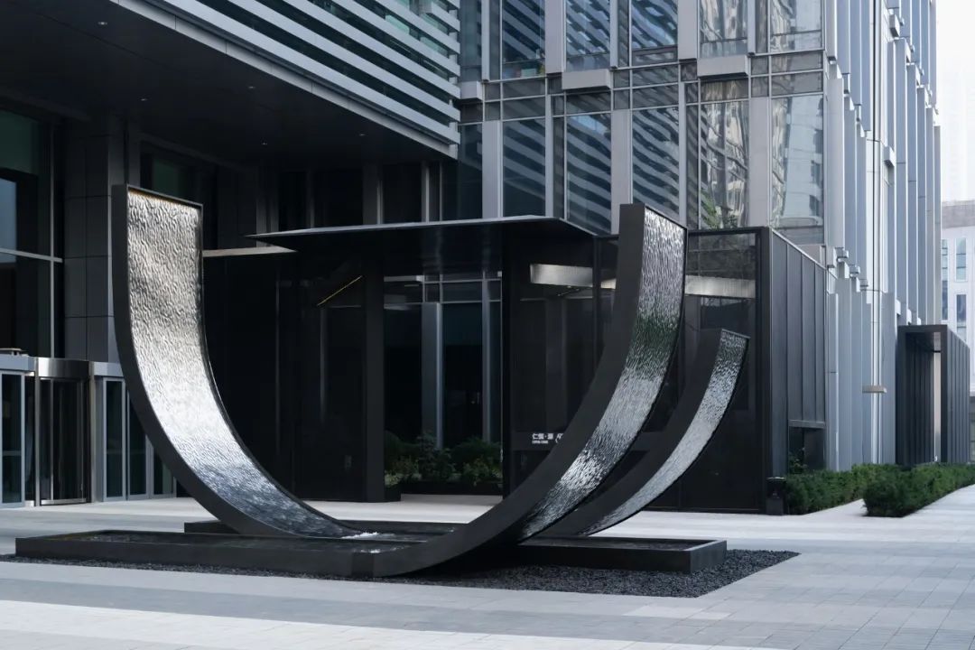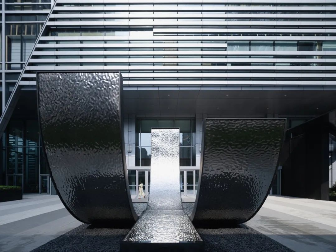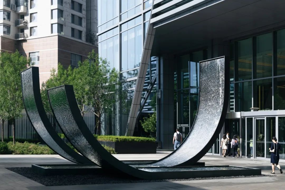 disappears in the metal mesh façade. Only exquisite remains.原本办公广场的中心较为空旷,缺少场地标识性及视觉焦点,因此在两个盒子之外我们还设计了中心水景雕塑。场地中大部分铺装需要保留,因此我们延续了原有的条状铺装的概念,从地面卷翘而起,形成极具雕塑感和艺术性的中心焦点的同时,也保证了整个设计体系的完整与统一。To infuse identity and focus into the