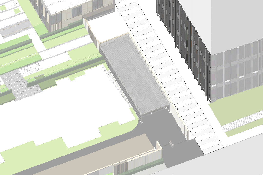 vehicular and pedestrian circulations. A floating black metal mesh, suspended