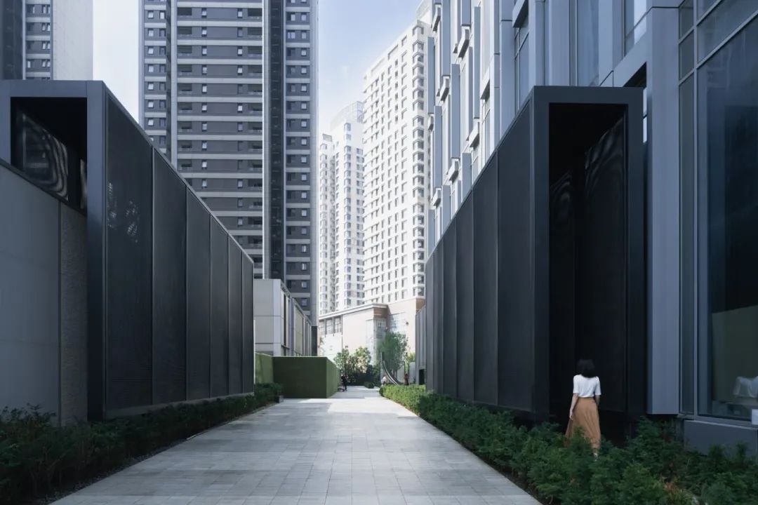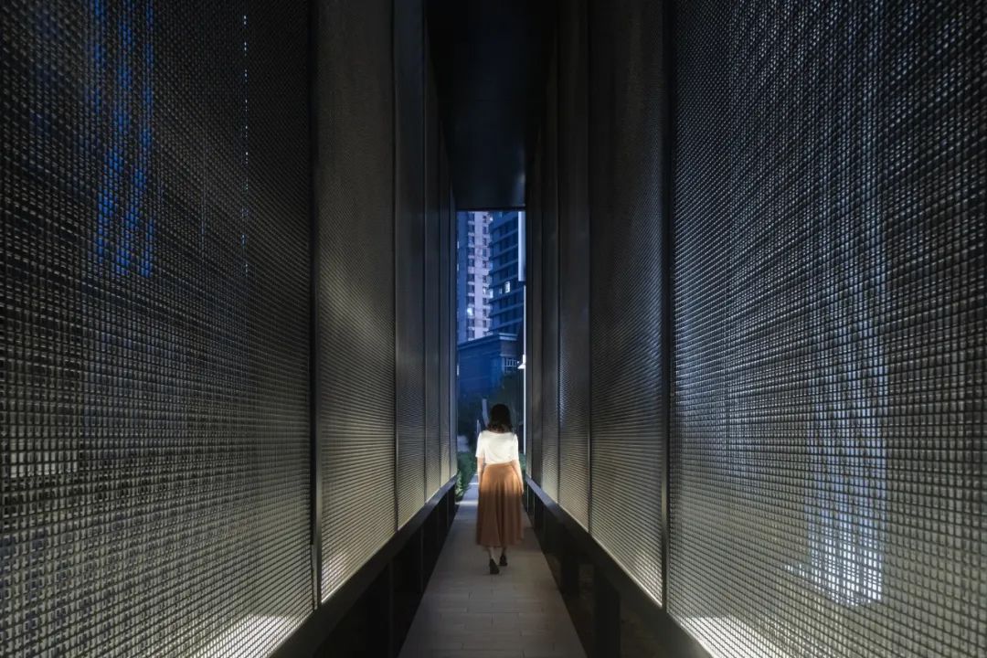 and TheAlfresco Box. While, owing to the evolving business formats,the construction of The Mystery Box has been temporarily postponed.「穿梭之盒」成为了踏入场地的首个空间,高耸的尺度起到了入口昭示作用的同时,将原本相对混乱的人行和车行流线进行分流。漂浮在绿化之上的黑色金属网,带来了穿越时空的奇妙感受。The Journey Box is the gateway to the