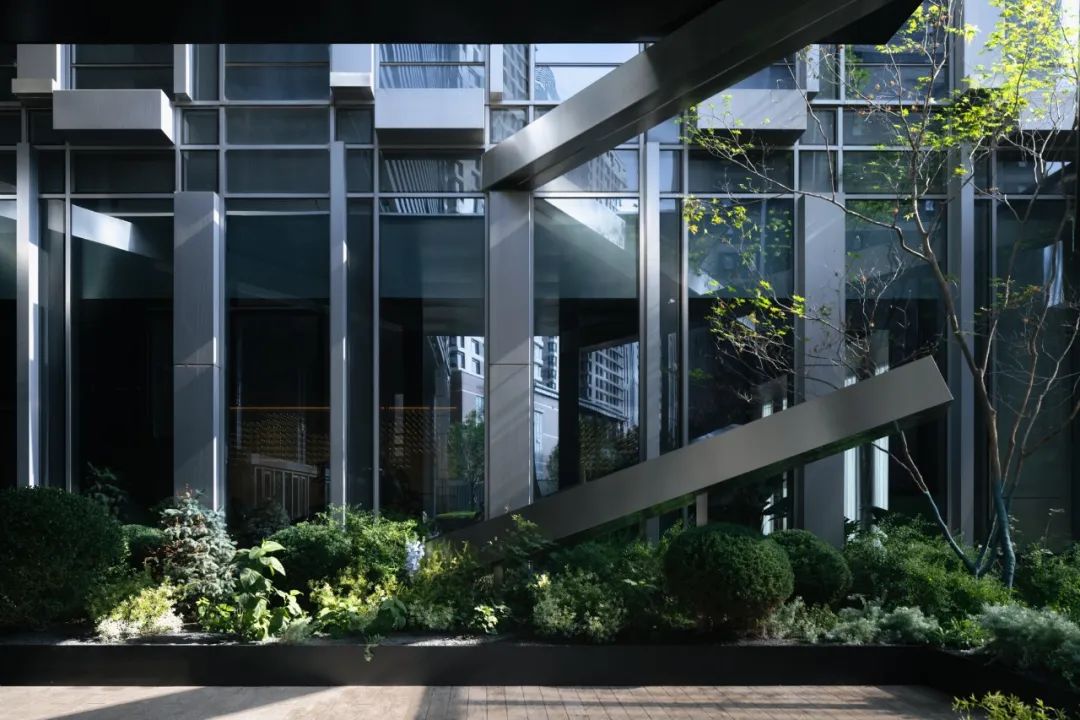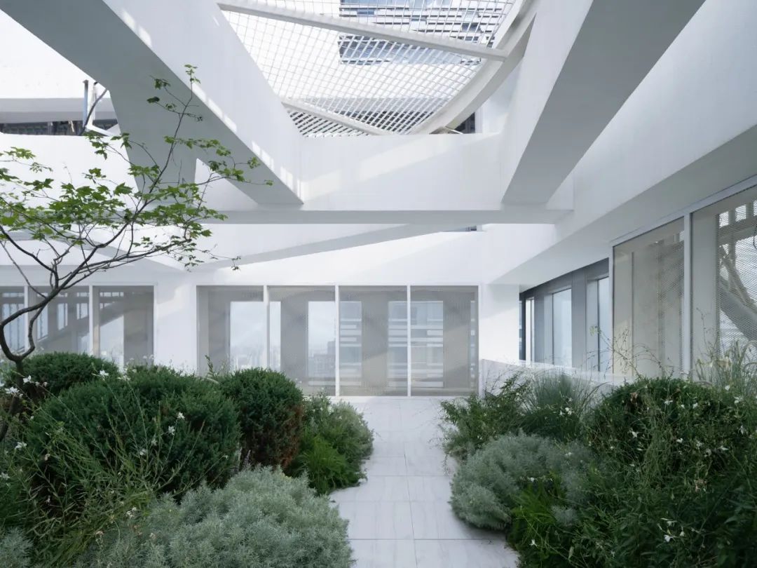 Photo© Li Qi在材料运输的过程中,改造项目的难度也可窥见一斑,不同于新项目可依赖塔吊,本项目屋顶花园的材料只能依靠货梯运输。因此我们采用模块化切分的方式,来适应货梯运输尺度,乔木选用较为舒展自然的小乔,在无法满足较大冠幅和高度需求的限制下,我们转向了尽可能展现植物姿态美的形式。