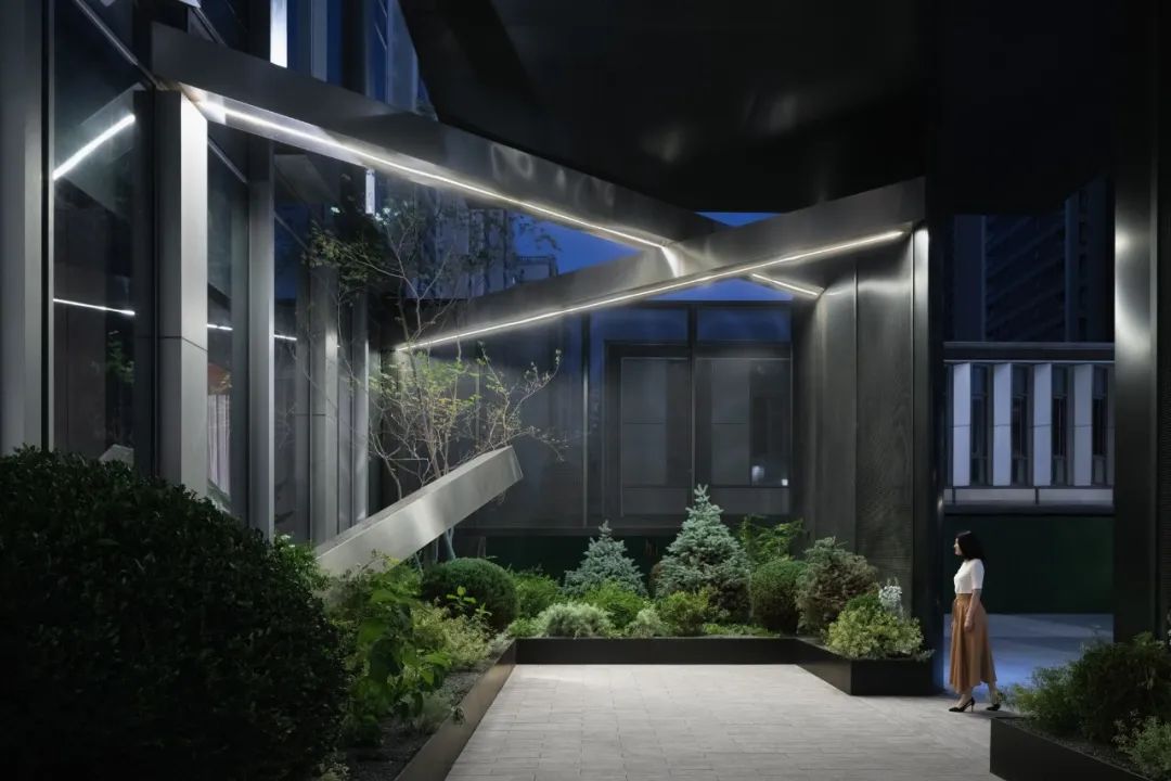 「迎宾之盒」为新增的仁恒源59的公寓入口,设计用半透的盒子在公共的办公广场中引入一个半私密的过渡空间。与开放且人流较密集的办公入口相反,迎宾之盒其静谧和隐奢的氛围,为住户营造出从外部的喧嚣中进入花园的独特入户体验。The "Greeting Box" welcomes