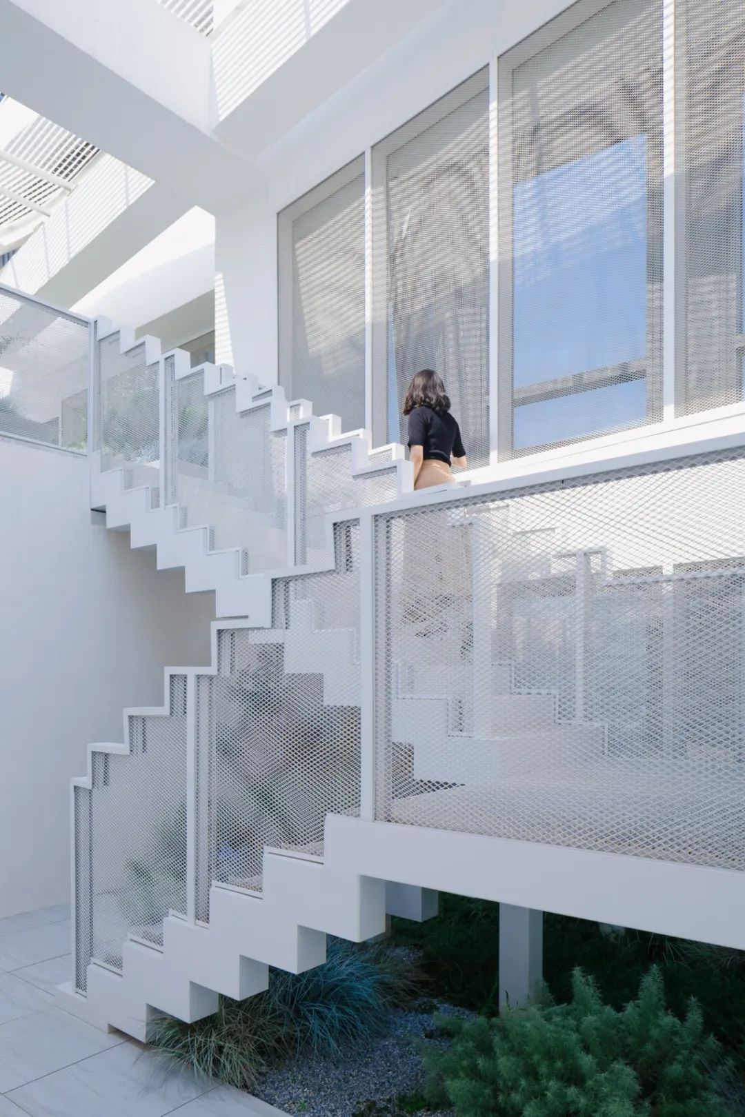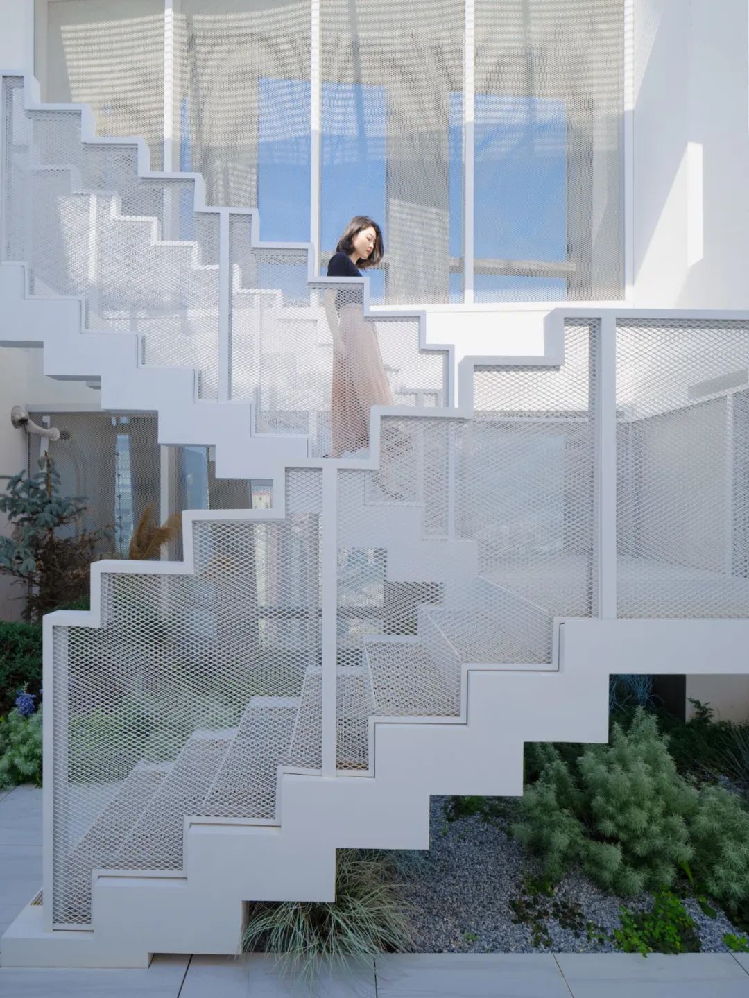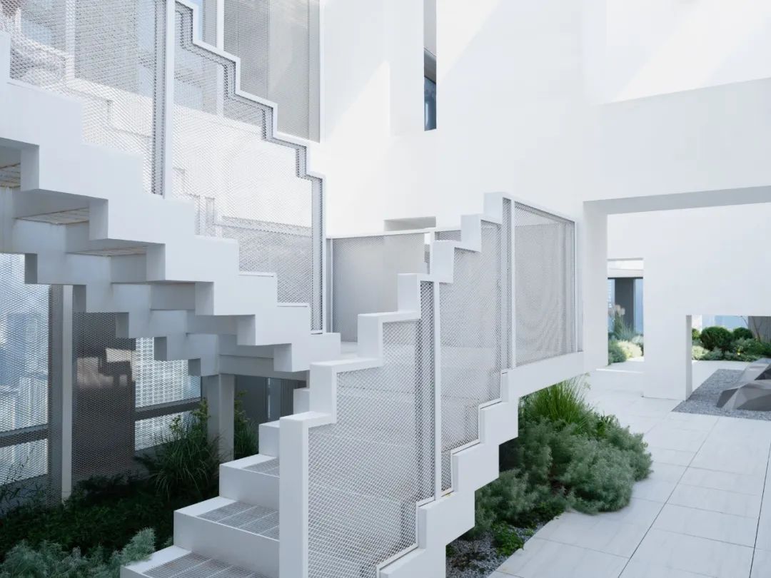 white metal staircase hovers above plants, guiding residents upward.