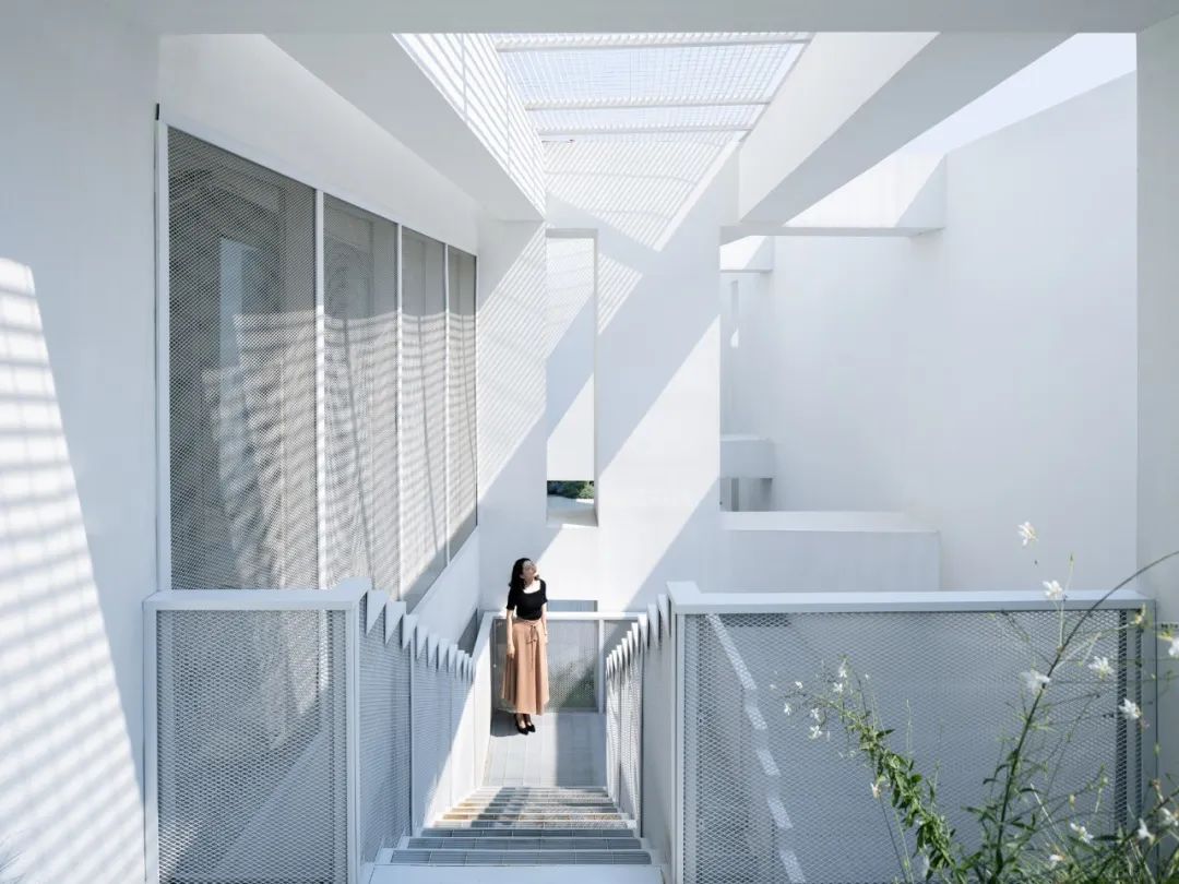 east region. 尽端为连接上下两层的三角形楼梯空间,其独特的造型也极具雕塑及艺术感。As one walked to the end, that triangular staircases serves as an closing of the artistic spatial exhibition.2层的漂浮连廊在视野较好的中部设置了休息平台,可以眺望远处。其通透的金属网也保证了下层空间的采光,并减少了压迫感。The unique, sculptural staircase connects