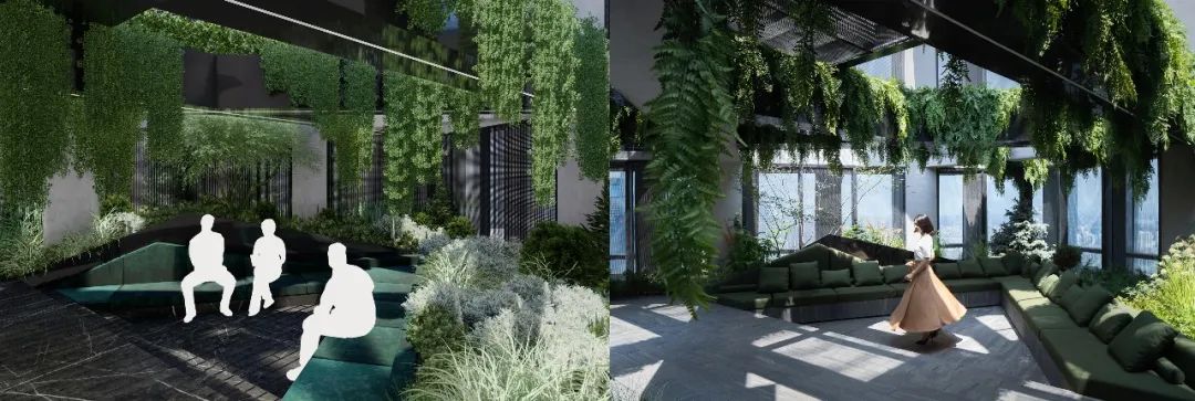 The optimal viewing spot eliminates metal mesh for the best view.在原有的梁柱的基础上,局部增强了柱网的序列感,衍生出了和梁体量相似的空中种植盒,为竖向添上一抹东北地区少见的森森绿意,漫出的垂挂植物也像幔帐一样对不同功能空间增加界定,又兼具趣味性与层次感。Enhancing the column grid created