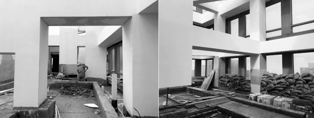 在施工的过程中,存在着层高限制和屋面顶板排水需求的双重矛盾,在无法按正常坡度排水的情况下,除绿化区域,硬质路面和砾石区底部均做了架空处理,底部面层做了防水找平以最大可能的保证雨水的流通。Construction posed dual challenges: floor