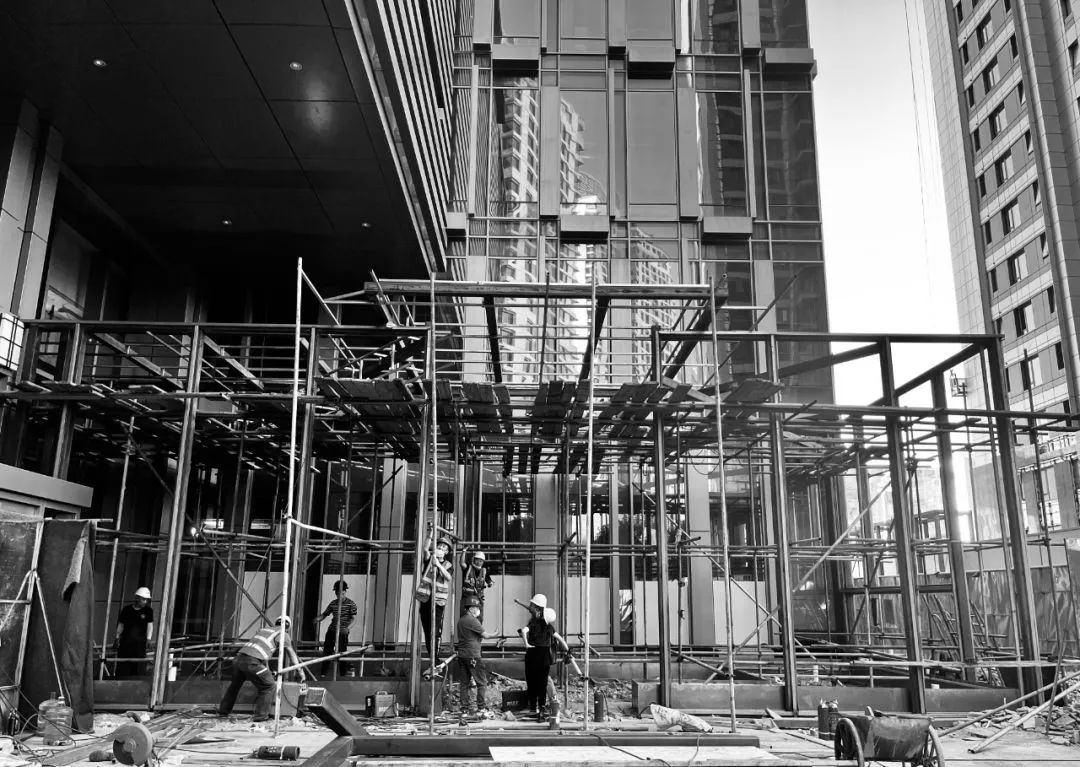 The foundation for the first-floor Greeting box, constrained by thin ground and a lofty building, required innovative solutions. Strip foundations formed a closed-loop frame, supplemented by roof reinforcements for stability. Waterscape sculpture thickness adjustments optimized water pump placement.Construction brought forth challenges such as floor height restrictions and roof drainage. The innovative use of modular segmentation facilitated transportation, while structural reinforcements ensured stability.▼迎宾之盒结构施工过程