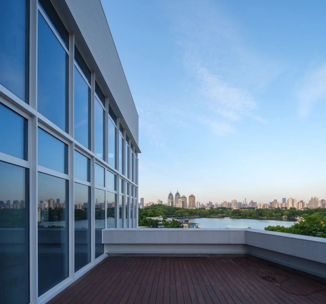 长风公园作为不可多得的景观优势,从设计之初,就一直是改造的重要考量之一。在处理与公园的关系上,我们希望建筑也能成为游园人眼中的城市风景,互相成就才是项目与长风公园之间最好的关系。作为城市界面,让建筑沿大渡河路横向展开,逐层渐退至屋顶花园,让建筑自然的生长、融入、变为公园的延伸。立面上也采用带形长窗与强韵律感的柱廊形式相结合,设计观景平台、阳台、露台、以及屋顶花园等一系列开放的观景空间,让景中人,亦是观景者。