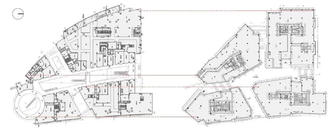 原平面东西两侧的商铺进深约30至50米,布置在十字形中庭两侧。结合对原有结构,以及对改造后办公空间的使用及采光问题的考虑,以原十字中庭为基础,创造性的将整个建筑直接拆解为4个。将“一栋大建筑”变成相互关联的“四栋小建筑”,将商业的活力和多功能的业态以及城市的开放性注入其中,为整个新的环境和新的未来创造一个更活力和开放的上海城市空间,并以此来化解因商业空间转换为办公空间导致的功能使用上的矛盾。