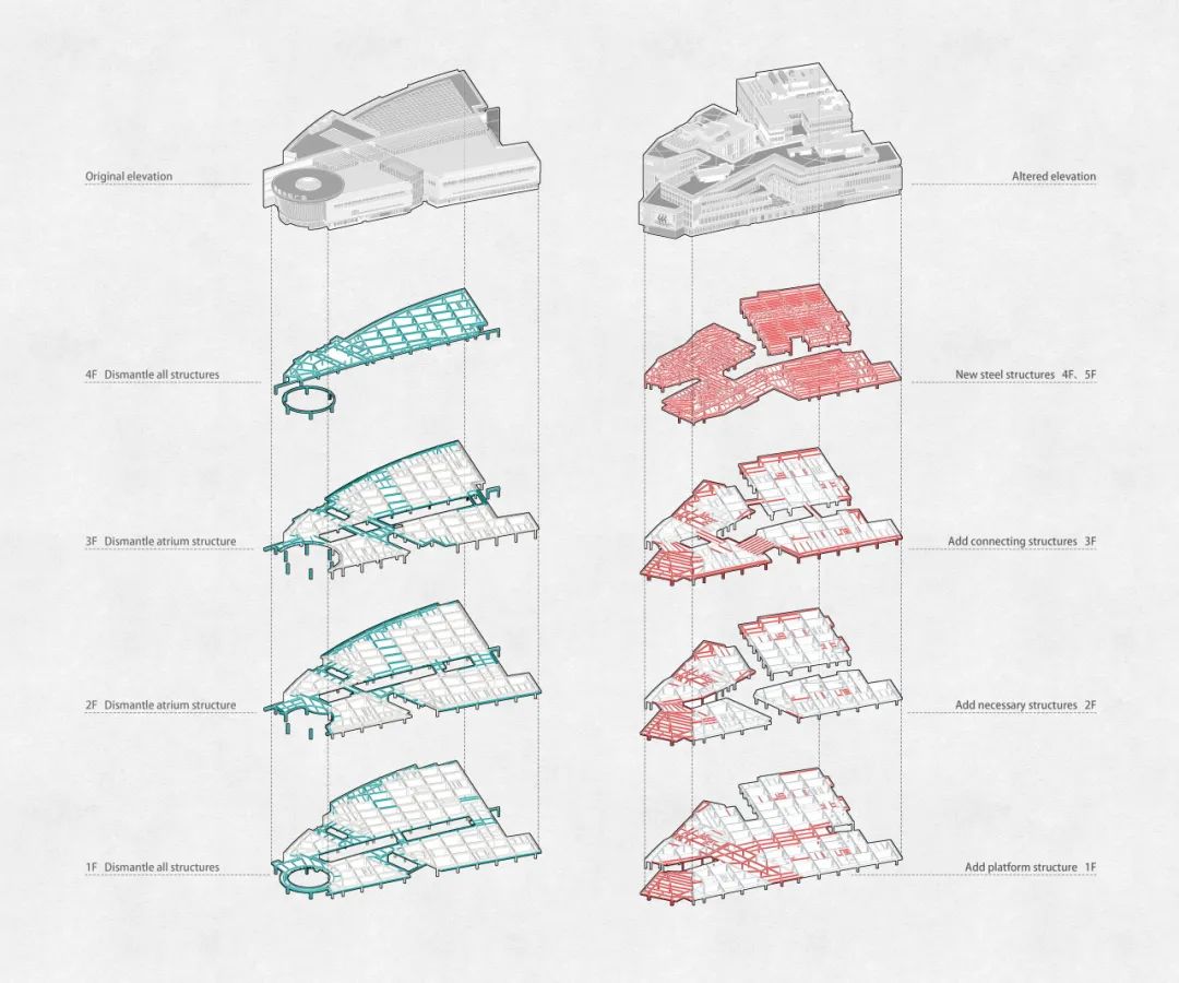 结构上,中庭两侧结构相对独立,所以考虑以原中庭位置为基础进行体量分解,在经过结构的反复计算与模拟,在尽可能的实现拆分建筑的设计理念的同时,选择拆除与加固更合理的结构方案。