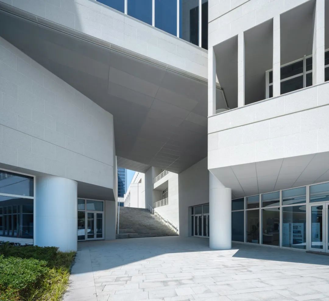 原建筑±0平面与东侧、南侧城市道路存在较大高差无法改变,所以设计上采用台阶引导空间的方法,让场景自然而然的“流入”。不同层次的台阶设计,与植物互相咬合,结合无障碍坡道,既增加空间趣味性,又能引入与吸纳人流,强调参与性、人性化 , 把诸多台阶空间作为日常停留,户外洽谈、冥想、小憩的文化空间。