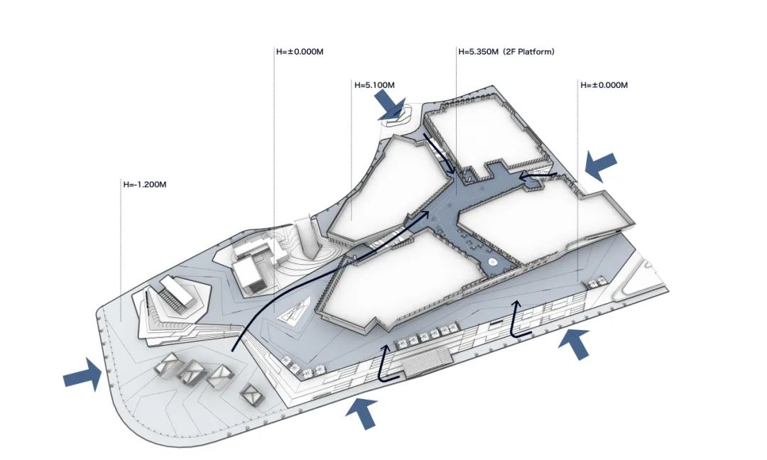 对建筑切割后,自然的形成了开放的街区空间。这个空间是开放的,也是内部的。为了使这部分空间在开放的同时,空间感上又区别于完全的公共场所,我们将“地面”抬升,在除沿大渡河路外的其他三个方向的开口处分别设计了三处大台阶,用来引入和抬升人流,并将沿大渡河路的开口设计成景观平台,作为面对城市主干道和面对长风公园的回应。抬升后的一层变为一个整体的空间,在功能上与地下一层的商业广场相联系,成为地下商业与地面文化场所的过渡和引导。