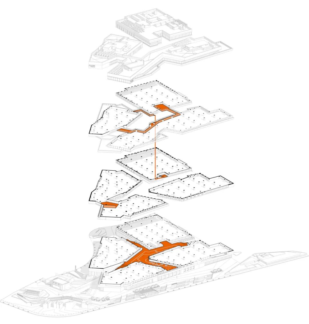 ◎分析图:连廊位置爆炸图,流线关系示意