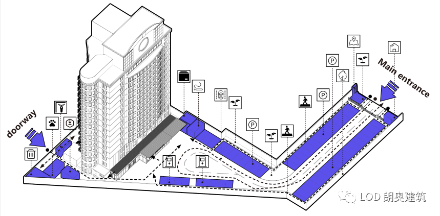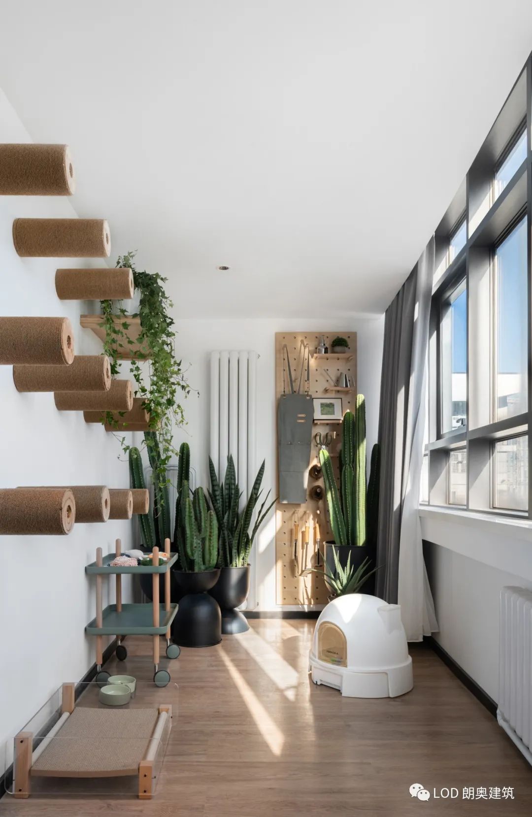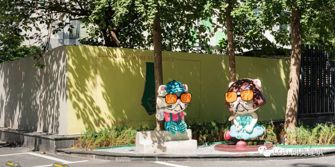 本项目拥有3137㎡私享庭院,景观设计了爱宠专属区域突出宠物友好及休闲游乐区:汪星人的环形山和猫薄荷主题花园,利用植物、砾石、铺地划分出独立休闲区、景观绿地、地面停车位,供不同需求及场景氛围使用。