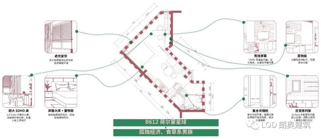 样板间分为3种风格模块,根据主题设计了不同房型,单间StudioA-6,C-1和1BR D-1比如电竞房、宠物友好房、网红直播房等, 分别对应代表人群斜杠UP、森系捕手、森鲜男主和撸猫小主的小家庭。