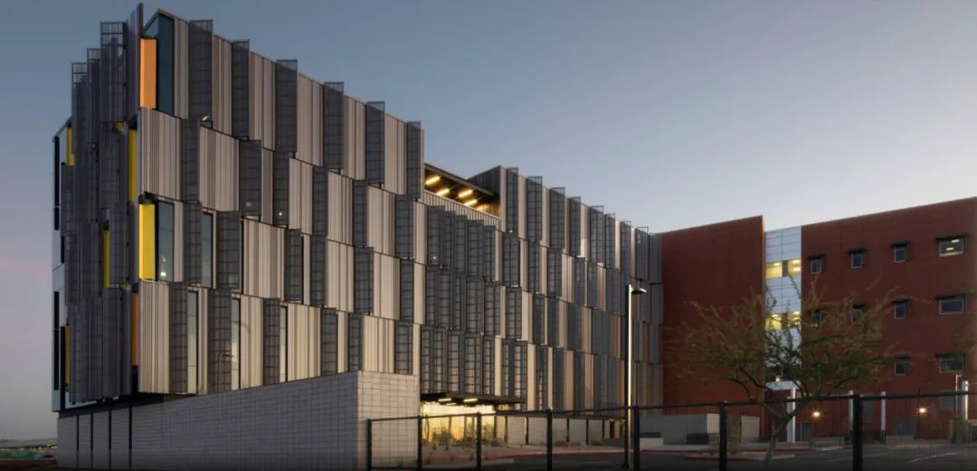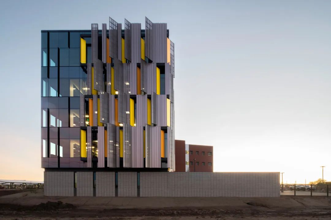 综合设计过程要求机电团队在初步设计阶段提交超越本阶段深度的文件,可以达到施工图90%深度,从而将建筑占地面积减至最低。这使得设计团队能够获得准确的设备尺寸,而非仅依赖对空间范围的预测。一般而言,暖通空调机房通常占总建筑面积的6%到8%,但通过提前交付的机电设计,成功将暖通空调机房的面积减少到建筑总面积的4%,从而节省了2,200平方英尺(204平方米)。此外,设计团队将建筑层高降低至14.5英尺(4.4米),由于建筑总高度的降低,进而减少了立面的总面积,最终降低了18%的立面造价。这座建筑引入了健康设计元素,旨在提高用户的舒适度和工作体验。充足的自然采光穿透到建筑核心筒区域,有效减少了对人工照明的依赖。室内设计巧妙地在每个楼层创造了休息区域,包括每层设有咖啡吧台以及位于五楼的室外阳台。洗手间的设计犹如一座酒店水疗中心,融合了禅宗的美学特质。此外,每位员工的工作空间都配备符合人体工学标准的办公桌,可调节高度以满足员工的个性需求。仿生学追求通过模仿自然的形态、过程和生态系统来创造对建筑功能有深远影响的设计。在这一理念下,设计团队深入分析了沙漠中的树形仙人掌,它通过连续的垂直自遮阳翼片,在极端的沙漠高温中巧妙地自我保护,茁壮成长。这些翼片能够产生遮阳效果并有效地重新分配热量,防止仙人掌外表面的任何区域变得过热。设计师创建了树形仙人掌的3D模型,并进行了日照模拟分析,确认了植物的任何部位在任何时候都不会接受超过15到20分钟的阳光直射,从而有效降低了晒伤的可能性。外立面设计巧妙借鉴了大自然的智慧,将仙人掌上移动的阴影转化为建筑上坚固的自遮阳板。立面上采用的黄色和橙色金属板灵感源自仙人掌花的色彩,为建筑注入了更为抽象和引人入胜的美学元素。在南立面和西立面需要窗户的区域,项目巧妙设置了向外挑出的穿孔板,这些板产生的阴影不仅有效遮蔽了窗户和外立面,降低了太阳直射热量的影响,同时也保留了室内良好的视野。这一设计既追求实用性又注重美感,为建筑增添了独特的视觉魅力。
