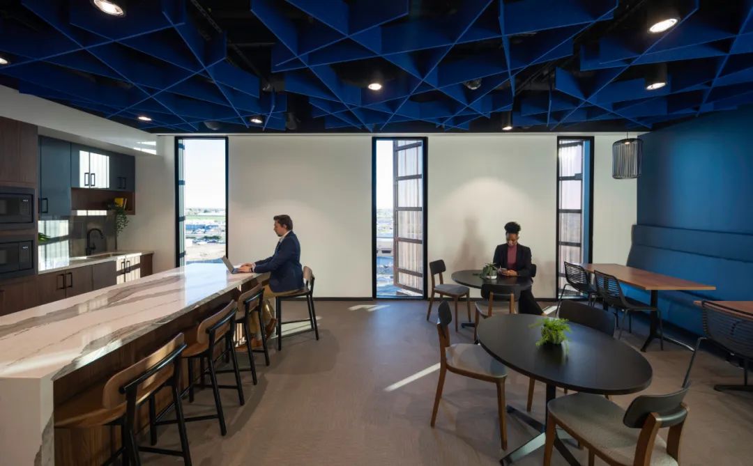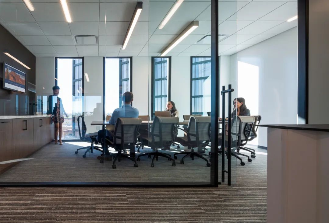 为了最大程度地优化自然采光,办公空间取消了高隔断的办公隔间,使得光线更为顺畅地穿过空间。同时,采用推拉玻璃门(而非传统的平开门),不仅提升了采光效果,还降低了交通面积。这一策略不仅使建筑平面轮廓更为精巧,而且最终将建筑面积成功减少到56,000平方英尺(5202平方米),进一步降低了建筑的占地面积。